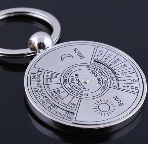 Этот брелок выделяется не только внешне — он ещё и выполняет практичную функцию. Внутри встроен круговой календарь, рассчитанный на 50 лет вперёд. С его помощью можно определить день недели для любой даты.