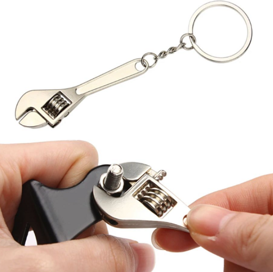 Брелок выполнен в форме уменьшенного разводного ключа и имеет подвижный механизм. Его можно использовать для работы с мелкими шестигранными гайками — затянуть или ослабить в случае необходимости.