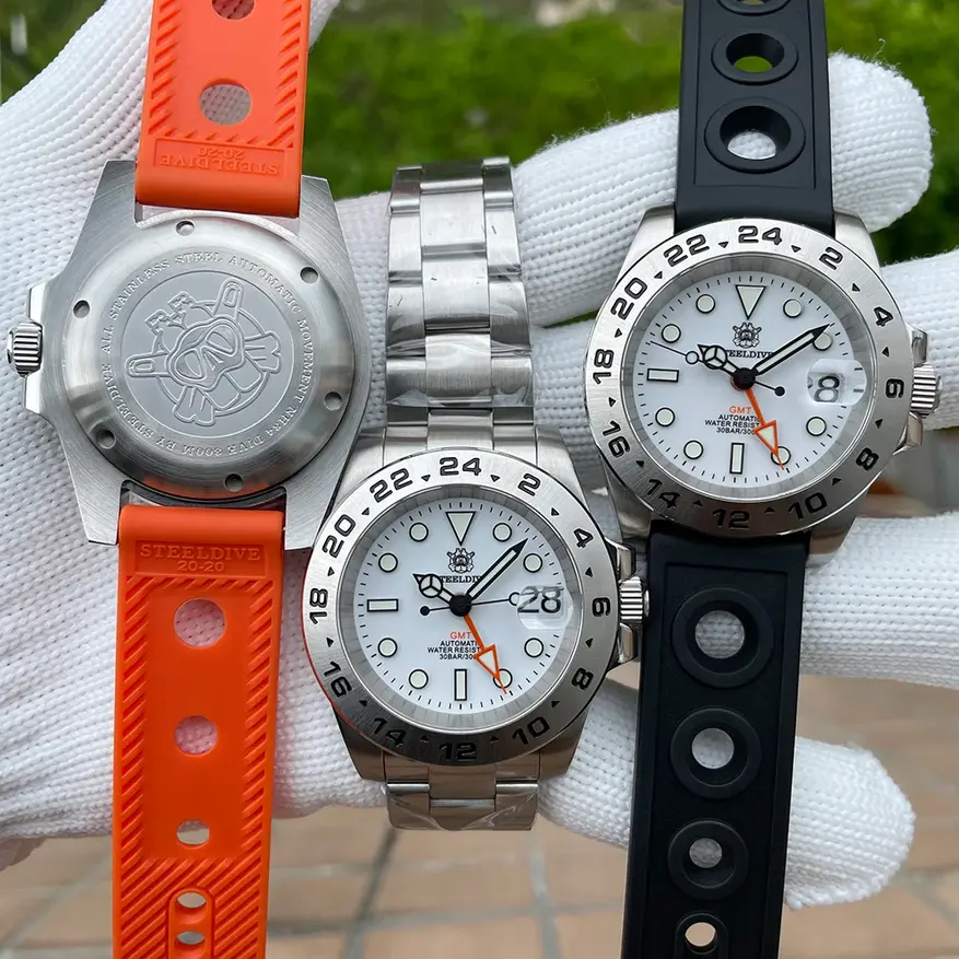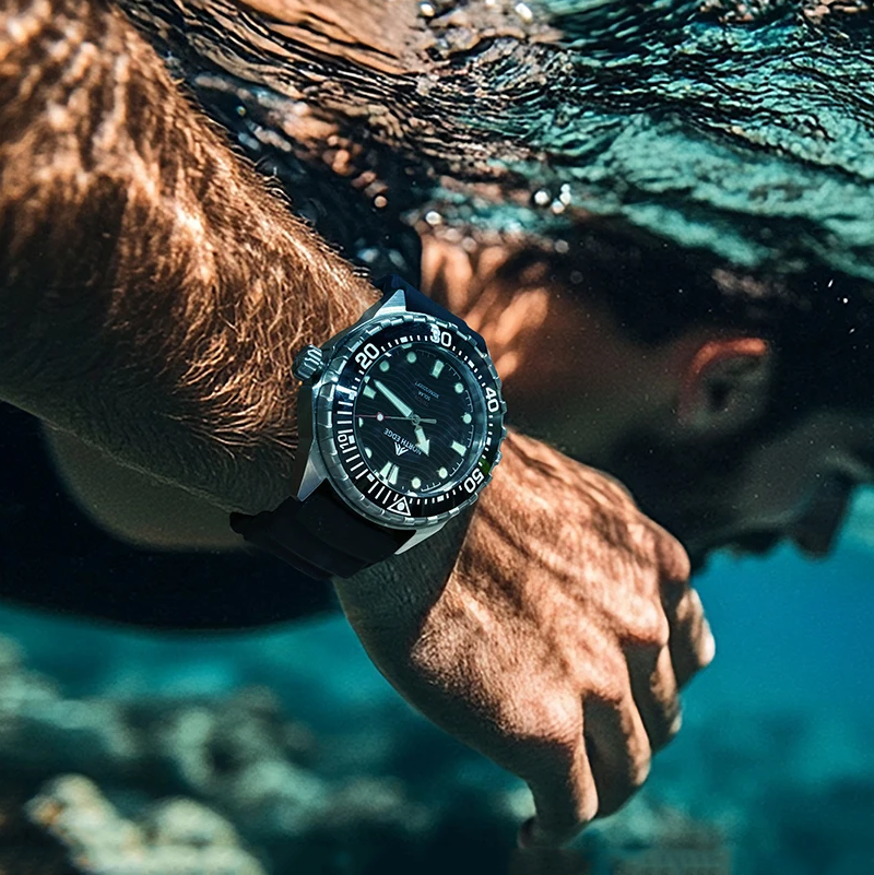 Механические часы от Steeldive — это практически полная противоположность рассмотренной выше кварцевой модели. У них компактный минималистичный циферблат диаметром всего 41 мм, а толщина в 13 мм позволяет без проблем «скрыть» их в рукаве. Сапфировое стекло с антибликовым покрытием обеспечивает видимость при любых условиях и высочайшую устойчивость к царапинам.