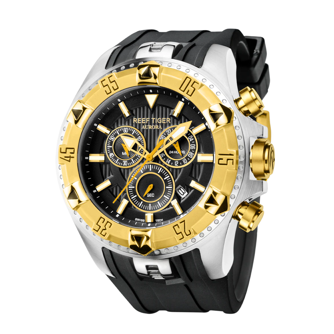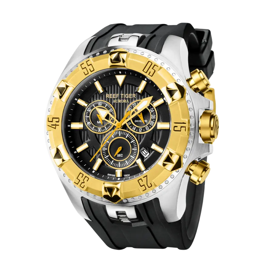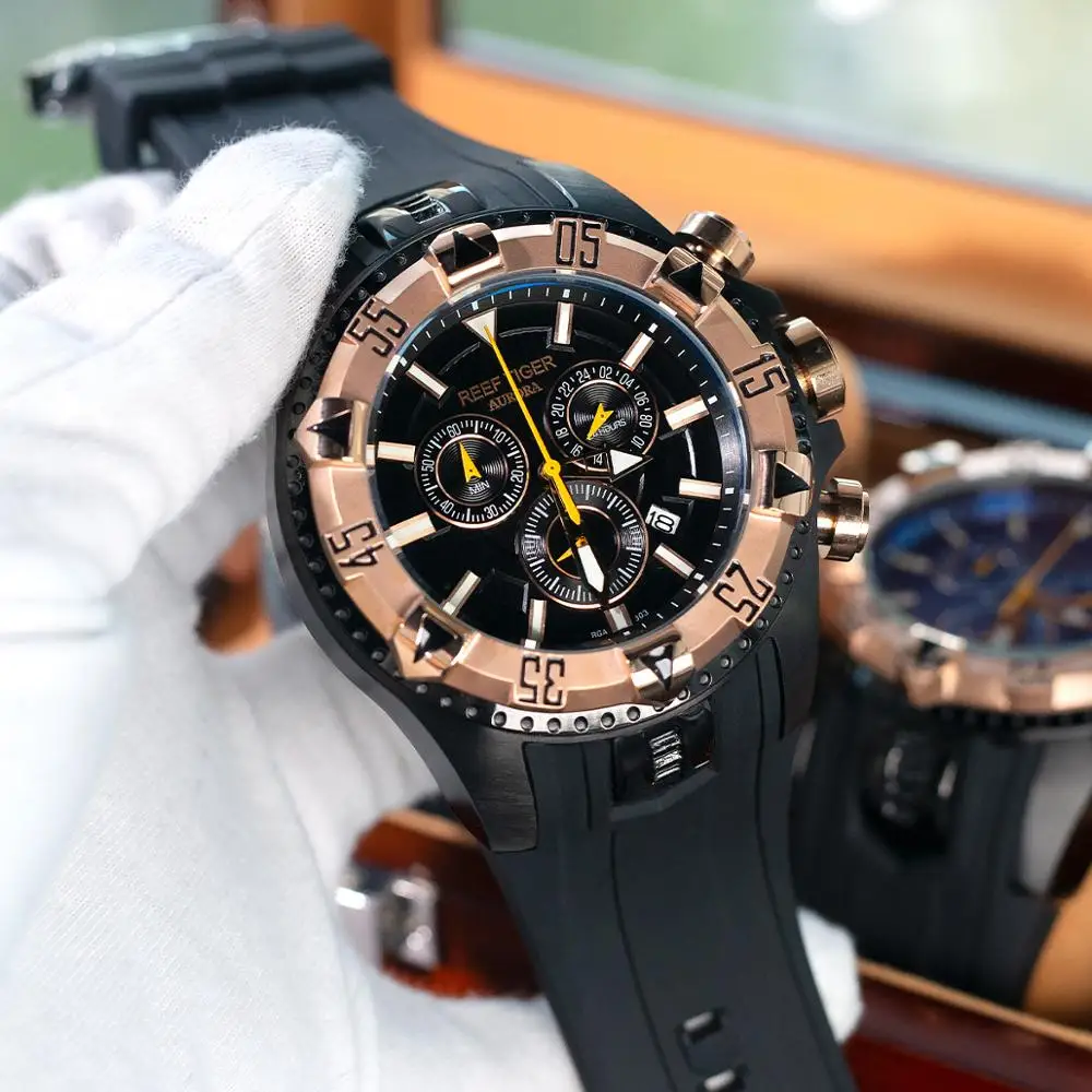 Часы из популярной линейки Aurora от Reef Tiger созданы для обладателей крупных запястий — диаметр корпуса у этой модели достигает 52 мм при толщине 17.5 мм. Ширина резинового ремешка также немаленькая — 33.5 мм.
