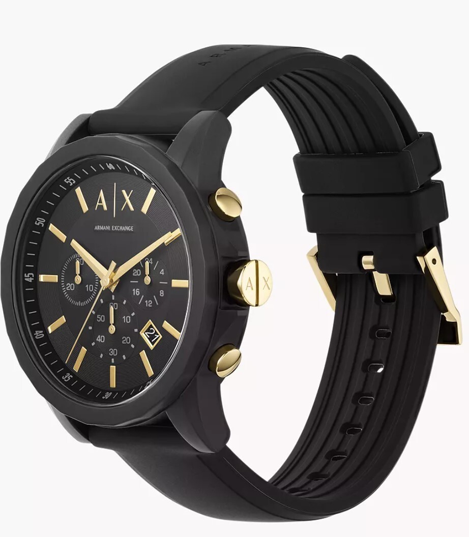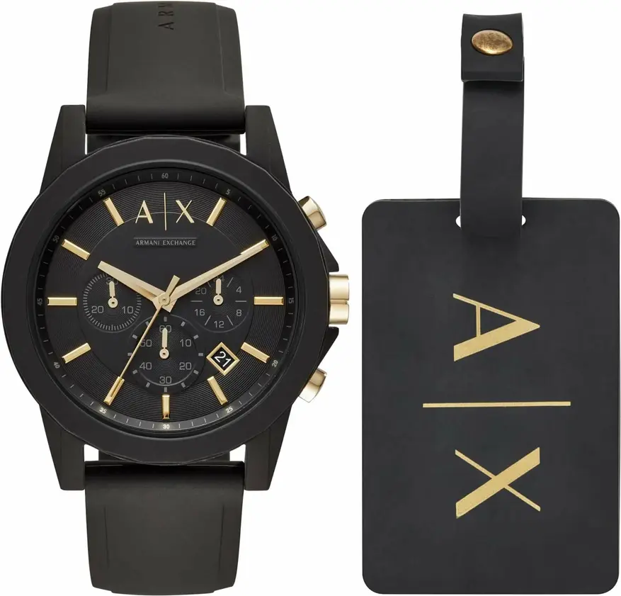 Далее идут часы от Armani Exchange — это в большей степени молодежный хронограф, ориентированный на любителей путешествий. По этой причине он поставляется в комплекте с брендированной биркой для багажа. Циферблат диаметром 44 мм легко читается благодаря четким индексам. Корпус выполнен из нержавеющей стали и имеет толщину в 12 мм.