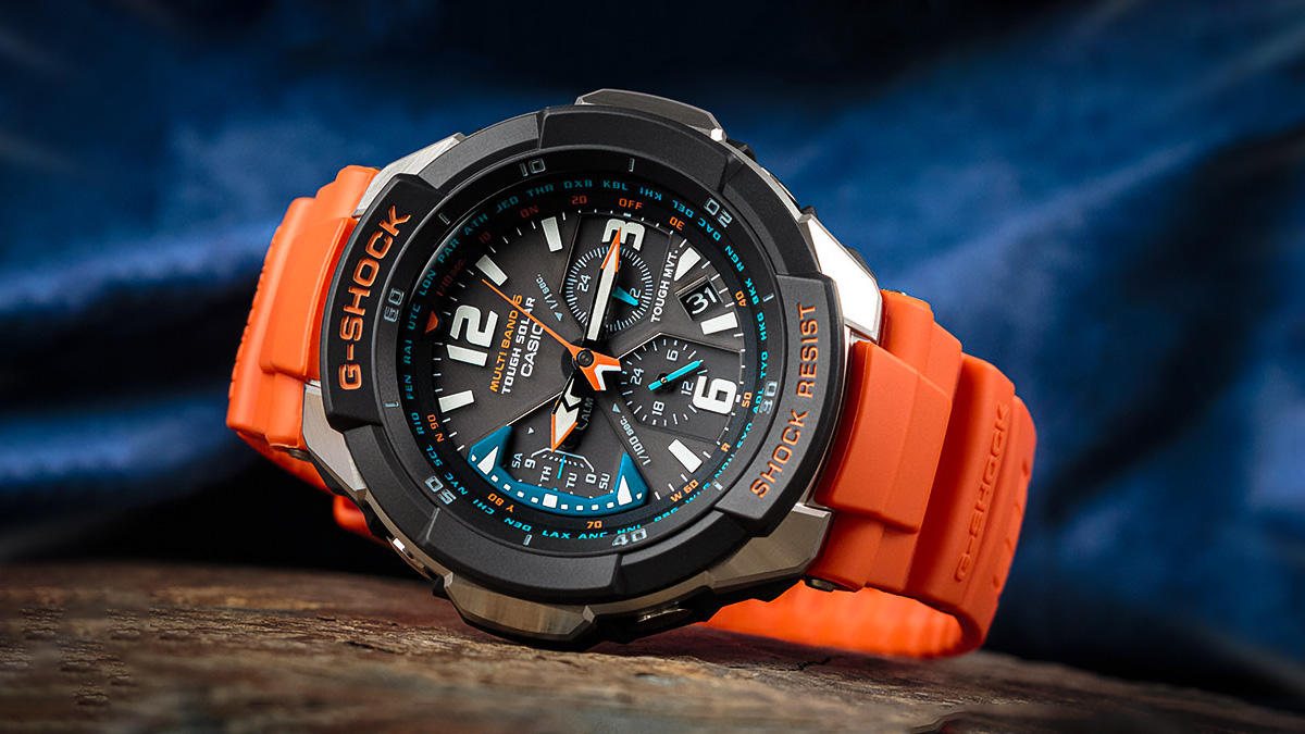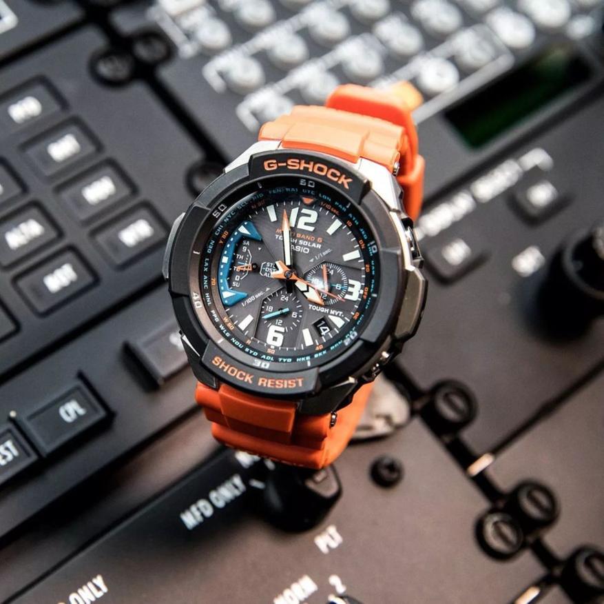 Данные часы из линейки G-Shock от японской Casio обладают ярко выраженной «авиационной» эстетикой. Впрочем, как и полагается G-Shock, вода им также не страшна — водонепроницаемость до 200 метров позволяет при необходимости использовать их и для дайвинга.