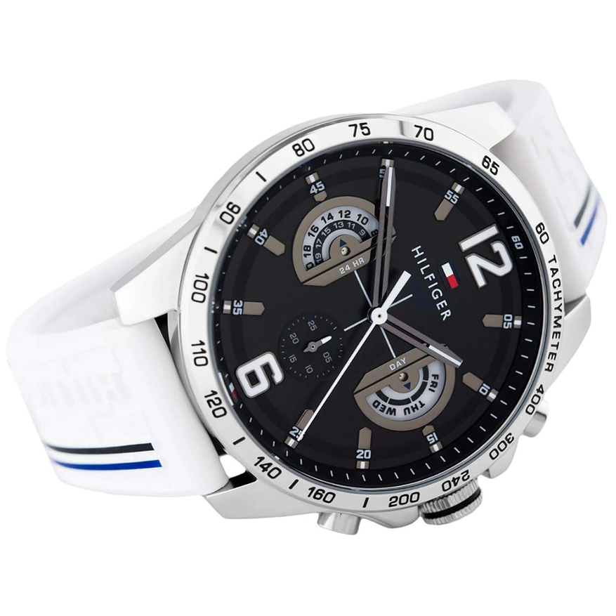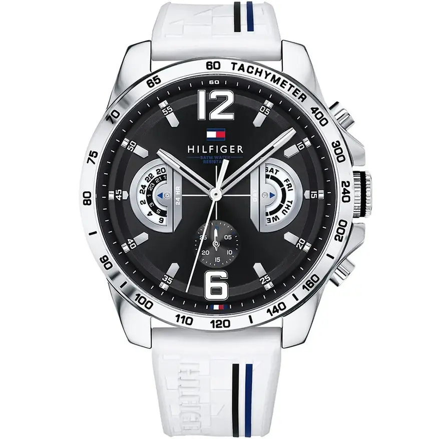 Часы из линейки Decker от Tommy Hilfiger — это классический кварцевый хронограф с крупным циферблатом диаметром 46 мм. Благодаря сравнительно тонкому поворотному безелю часы не выглядят массивно. Корпус толщиной 12 мм выполнен из нержавеющей стали и весит 100 г — это обеспечивает ощутимое присутствие на запястье, но не утомляет в течение дня.