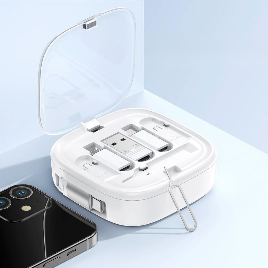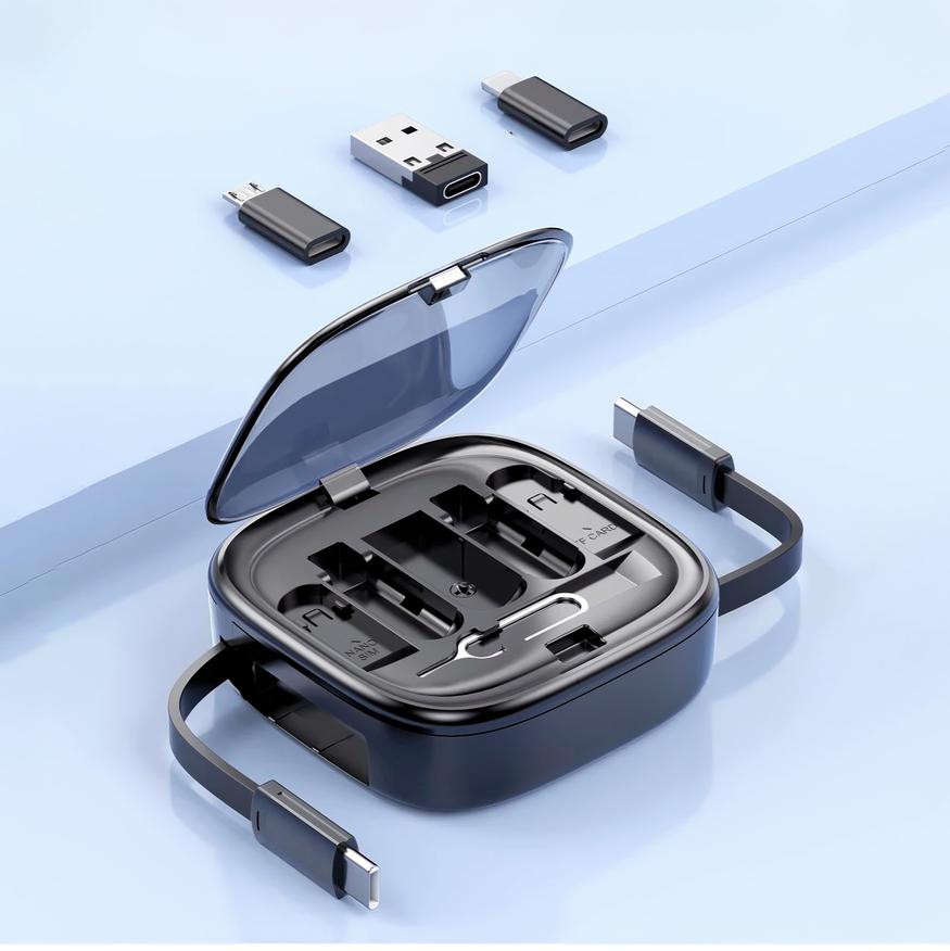 Метровый кабель мощностью 60 Вт — лишь часть комплекта, главной особенностью которого является специальная коробочка-мультитул. В ней собрано всё необходимое путешественнику: от скрепки для извлечения лотка SIM-карты до внушительного набора переходников, позволяющих соединить практически любые устройства.