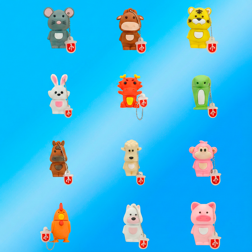 Завершает подборку коллекция, которая идеально вписывается в новогоднюю тематику. Эти флешки выполнены в виде животных из китайского календаря. Отличная идея для подарка, ведь можно выбрать фигурку — символ наступающего года или года, в который родился ребёнок. Такой презент будет нести в себе дополнительный, символический смысл.