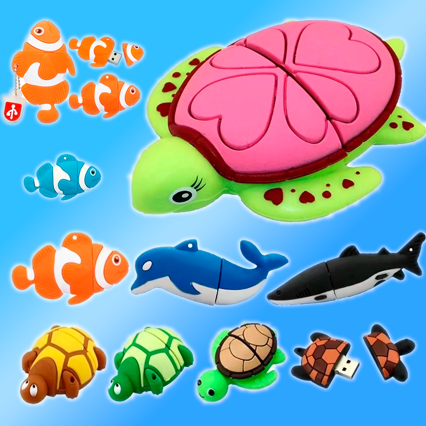 Начнём с морских глубин. Этот набор — настоящая находка для юных исследователей океана и всех, кто неравнодушен к его обитателям. Производитель предлагает целую коллекцию подводных жителей, выполненных в виде объёмных 3D-фигурок. Здесь есть всё, чтобы собрать свой карманный аквариум: от мудрой морской черепахи и игривого дельфина до забавной рыбки-клоуна и даже грозного, но симпатичного кита. Каждая флешка — маленькая, приятная на ощупь игрушка, внутри которой скрывается накопитель.