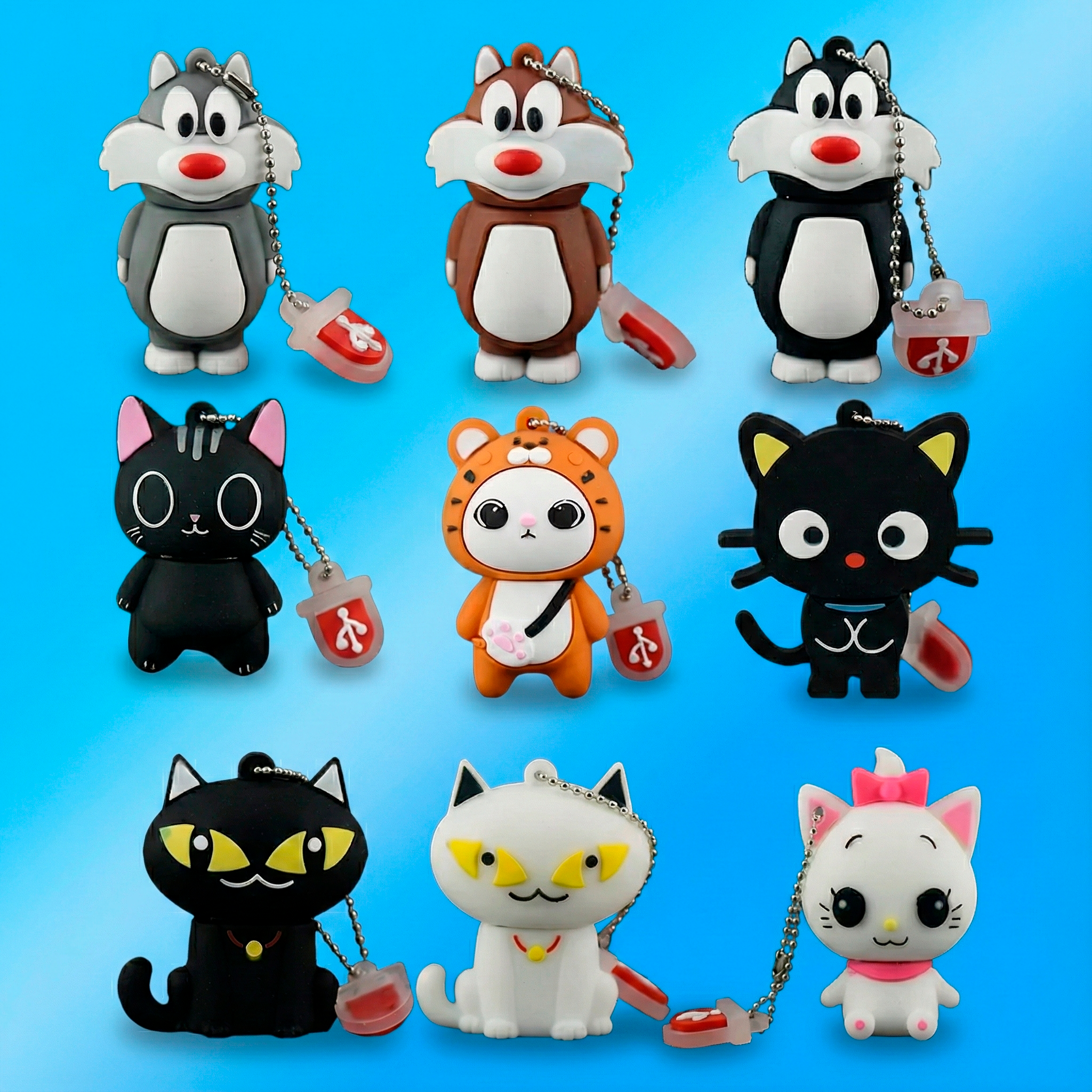 Для тех, кому предыдущий набор показался недостаточно проработанным, я нашел кое-что особенное — серию, которую условно можно назвать «Котики 3D+». В этом наборе представлено всего 4 варианта, но скромность ассортимента с лихвой компенсируется качеством исполнения. Здесь мы видим не просто схематичные фигурки, а результат кропотливого 3D-моделирования. Каждая деталь проработана с особой тщательностью. Более того, эти флешки отлиты из специального мягкого материала, напоминающего софт-тач силикон, что позволило производителю запечатлеть мельчайшие нюансы фактуры.