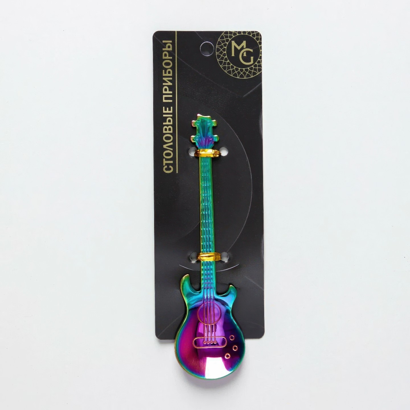 Любителям музыки придётся по вкусу ложка, стилизованная под электрогитару. Дизайнеры постарались максимально точно передать характерные черты музыкального инструмента: от изгибов корпуса до имитации грифа на ручке. Особого внимания заслуживает уникальное «бензиновое» покрытие, создающее переливающийся эффект и довершающее образ.