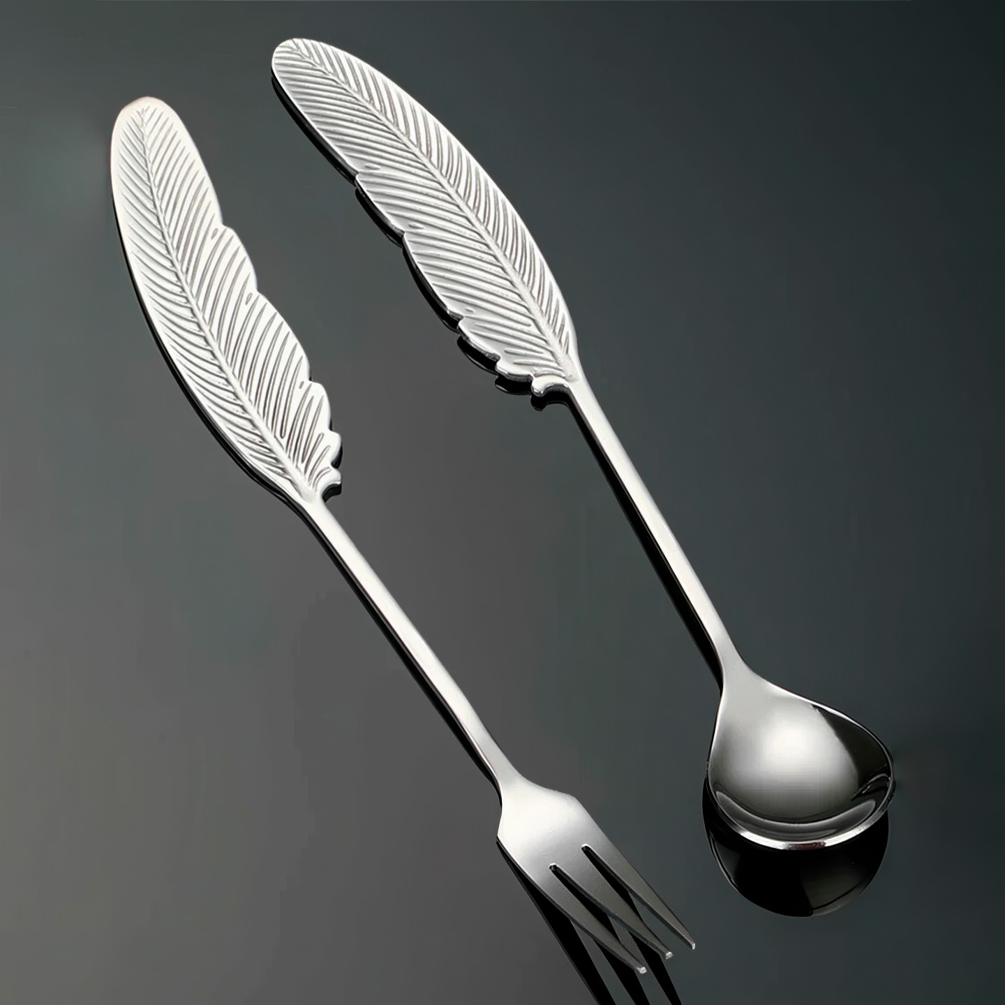 Для творческих натур я нашёл особенный комплект — чайную ложку и десертную вилку, увенчанные изящными навершиями в виде пера.