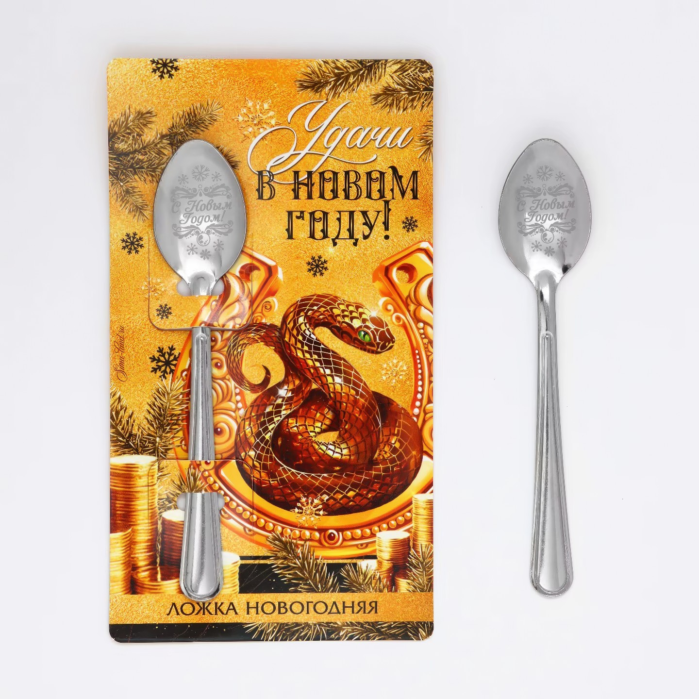 Завершает подборку праздничная ложка с гравировкой «удачи в новом году». Лаконичная надпись, изящно выгравированная на зеркальной поверхности, дополнена россыпью снежинок и еловых веточек. Блистерная упаковка оформлена как полноценная новогодняя открытка — с праздничным дизайном и поздравительной надписью.