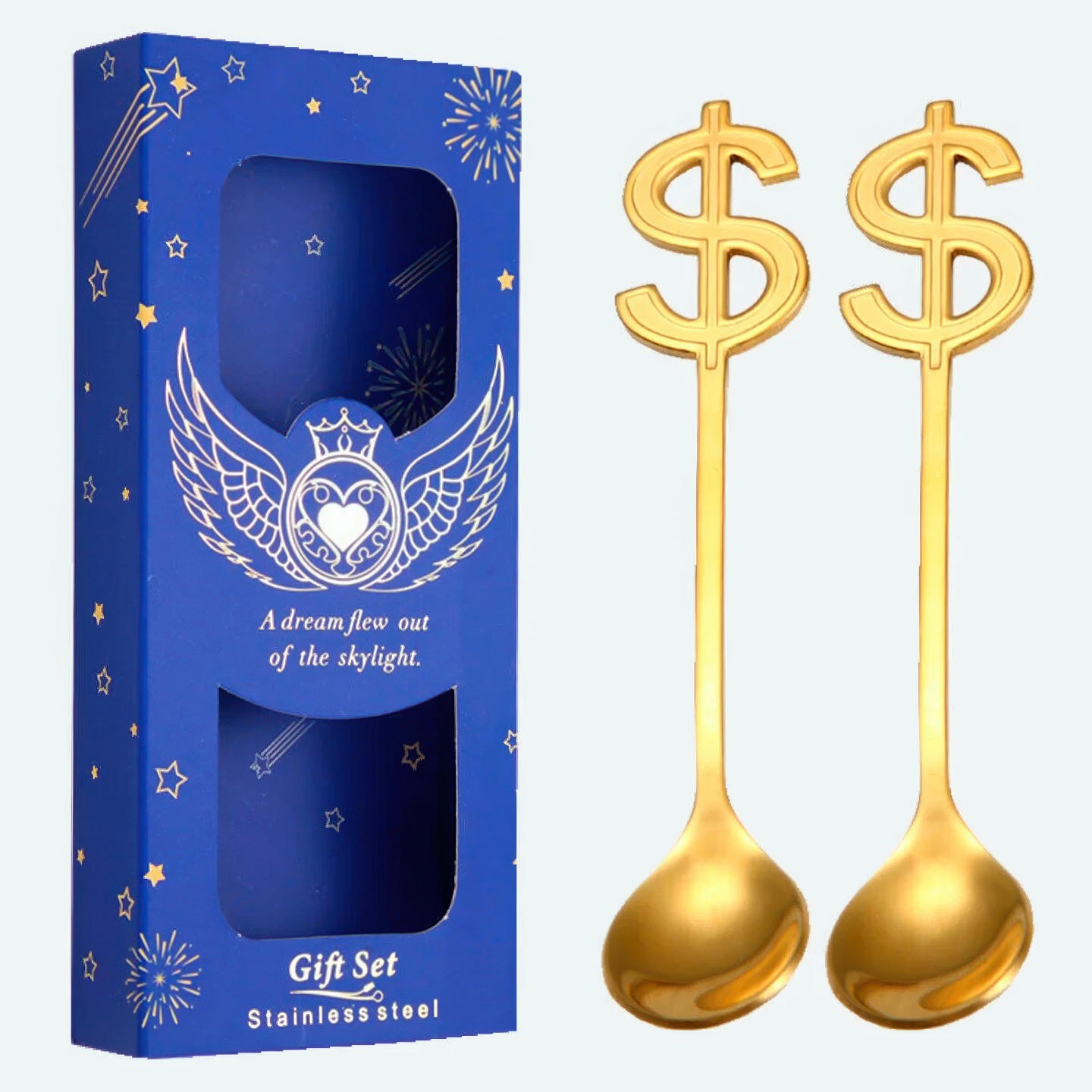 Юмористический подход к теме финансов воплотился в наборе из двух золотистых ложек с ручками в форме значка американского доллара. Комплект поставляется в подарочной коробочке с прозрачным окошком, через которое виден благородный блеск металла. Рельефный рисунок на черенках детально повторяет элементы знаменитой банкноты.