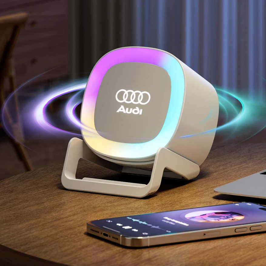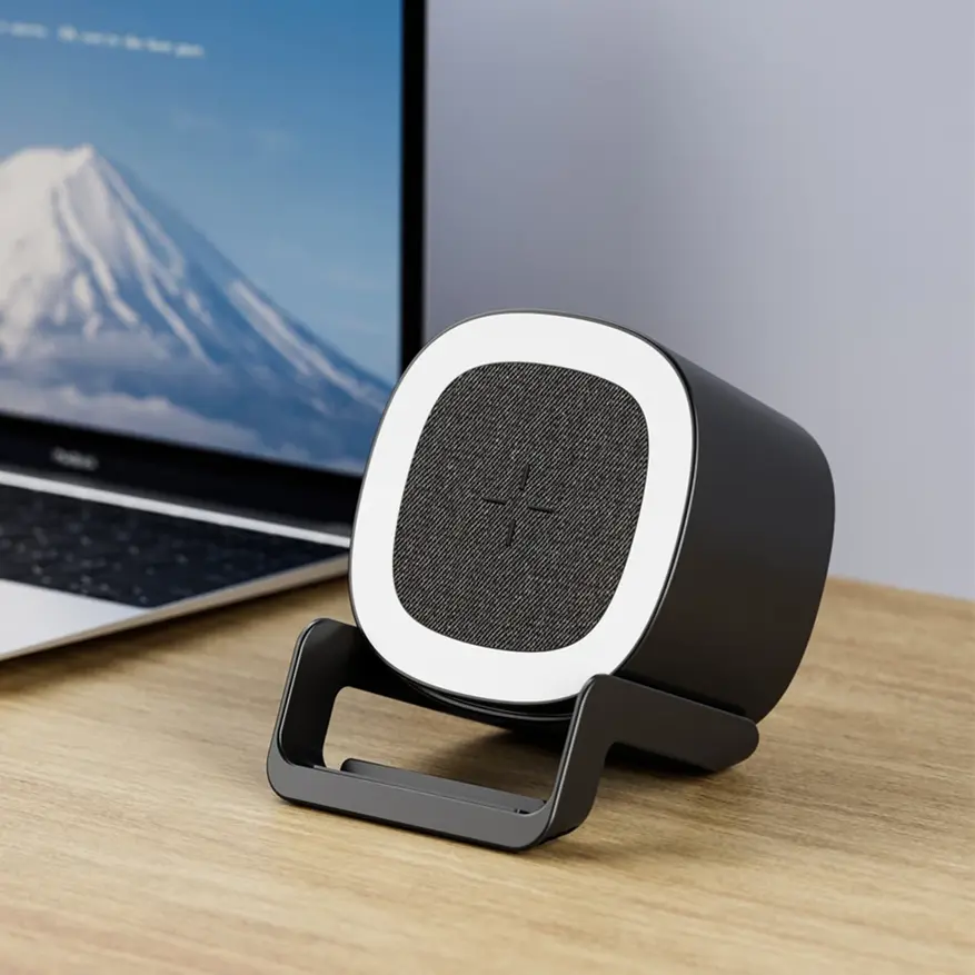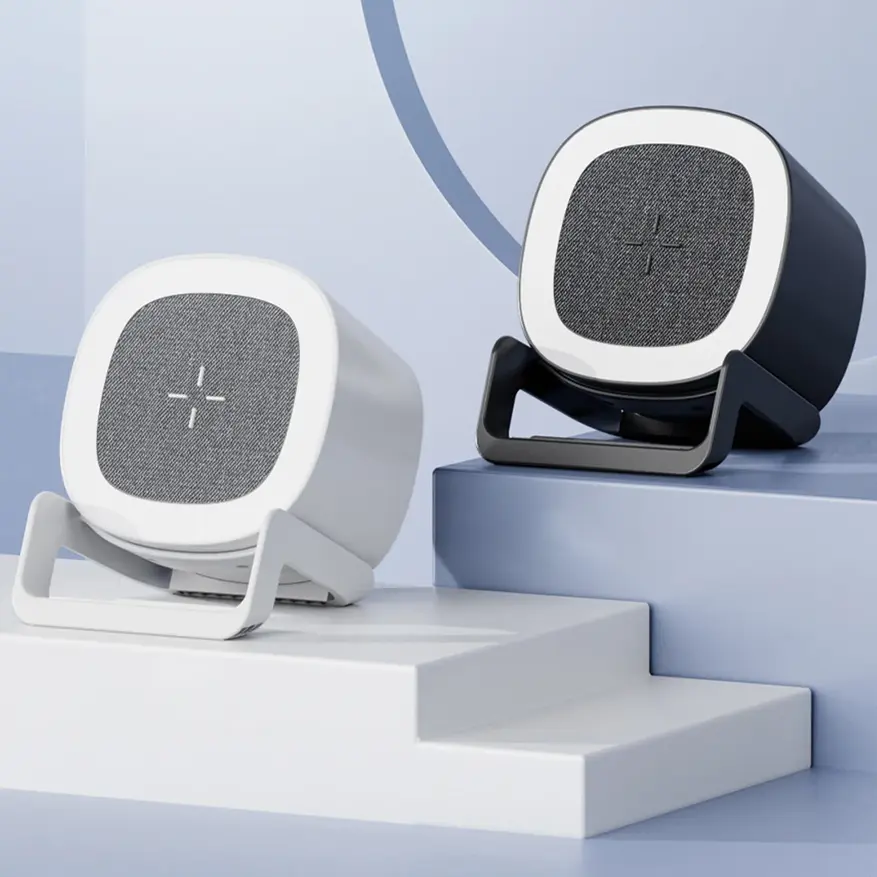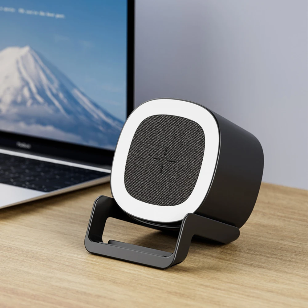 Далее идет стильный настольный аксессуар, объединяющий Bluetooth-колонку на 5 Вт, беспроводное зарядное устройство на 15 Вт, подставку для телефона и светильник.
