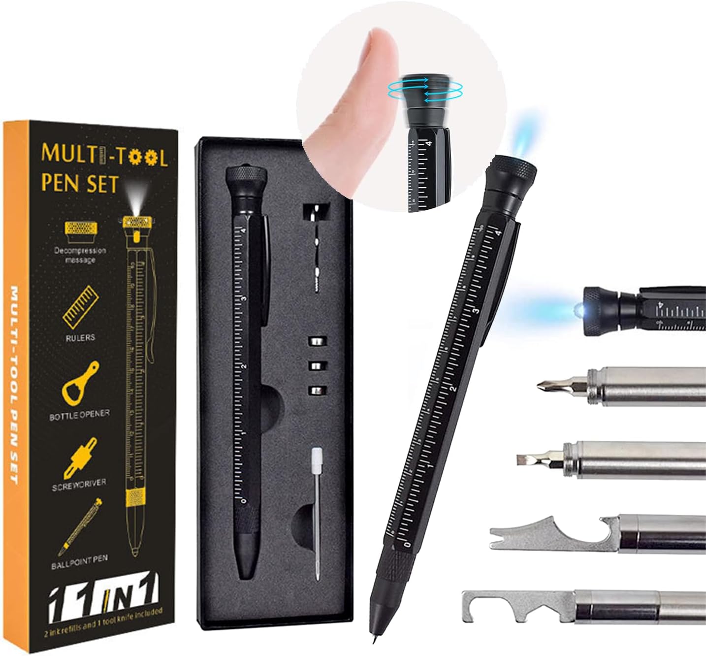 Пример необычного подхода к концепции EDC-инструмента — полнофункциональная шариковая ручка длиной 160 мм, скрывающая 11 полезных функций. Металлический корпус черного цвета выглядит достаточно презентабельно для офисного использования, при этом предлагая решения для бытовых задач.