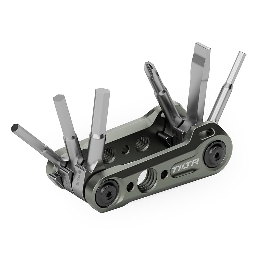 Набор инструментов включает четыре шестигранника (2.5 мм, 3 мм, 4 мм и 3/16 дюйма), плоскую и крестовую отвертки, а также Torx T25 — полный арсенал для обслуживания съемочной техники. Боковые резьбовые отверстия M2.5 — M5 и 1/4″ служат для хранения запасных винтов — продуманная деталь для профессионального использования.