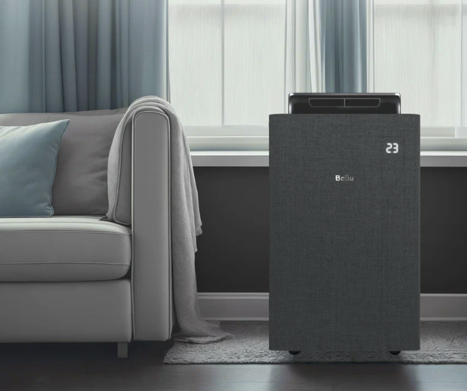 Корпус лаконичный, без лишнего декоративного «шума». Устройство весит 22,5 кг, легко перекатывается с помощью встроенных колёс и ручек. Внутри работает экологичный хладагент R290 — эффективный и безопасный, соответствующий современным стандартам.