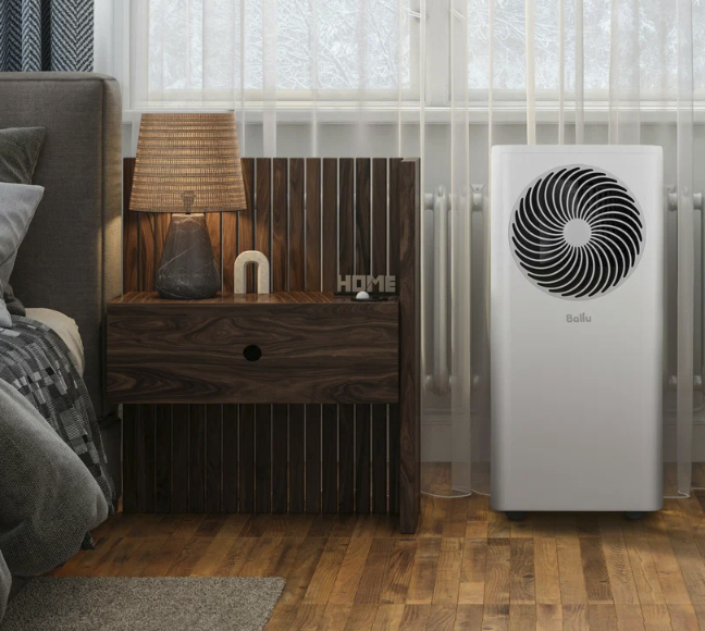 Этот мобильный прибор не требует монтажа и не привязан к одной комнате — достаточно вывести шланг в окно, подключить к розетке, и он сразу начинает работать на полную мощность.