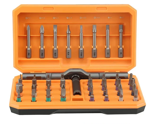 Набор включает 45 предметов: пинцет, удлинитель, ручку 12 см и 35 бит различных типов — Torx, Hex, Phillips, Slotted, треугольные, звёздчатые, Y-образные и круглые. Материал — хромованадиевая сталь. Вес — 345 г, размеры кейса — 155 x 115 мм. Производство — JACKLY, Китай.
