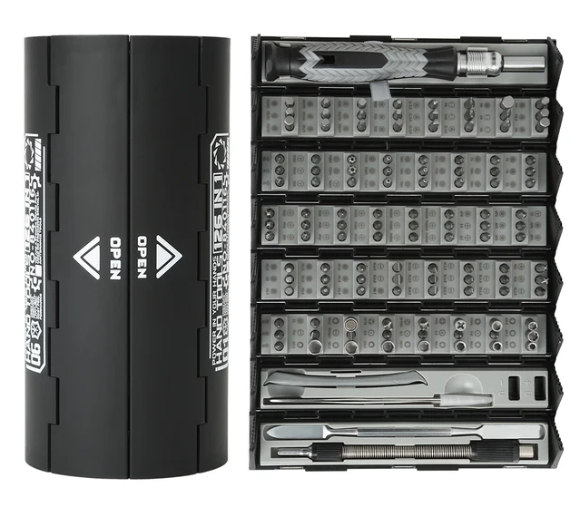 Набор объединяет 117 предметов, включая отвёртку, пинцет, гибкий удлинитель, держатель бит и вспомогательные инструменты для мелкого ремонта. Все насадки изготовлены из никель-хромового сплава и имеют разнообразные форматы — Phillips, Slotted, Torx, Hex, Y, Pozidriv и другие. Комплект упакован в прочный пластиковый кейс 160 x 55 x 90 мм с прозрачной крышкой, защищающей элементы от повреждений и пыли.