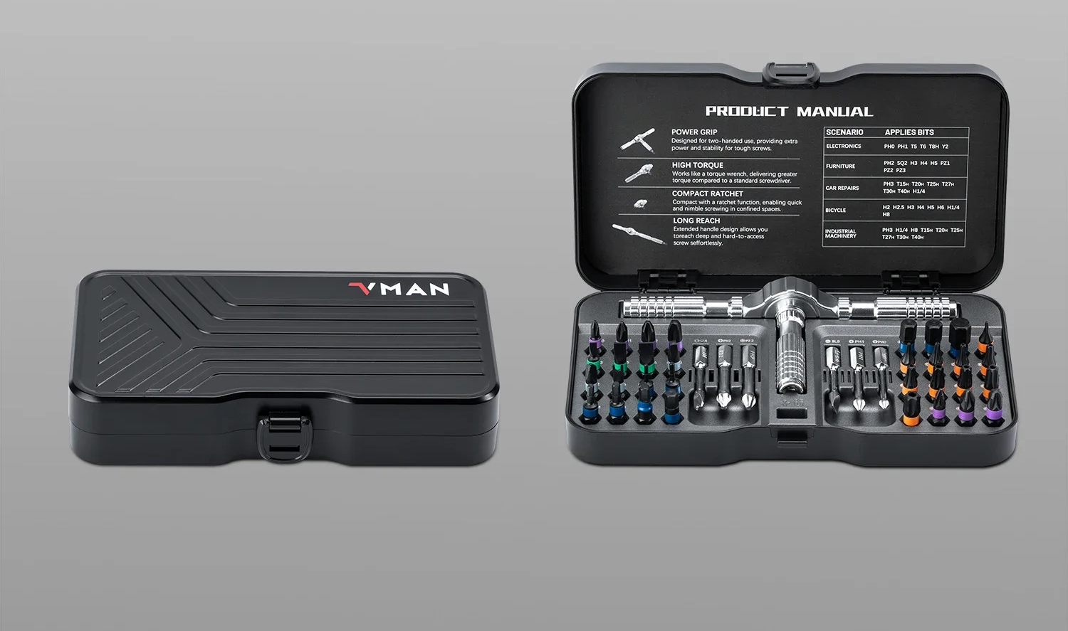 В компактном кейсе размещены 32 короткие и 6 длинных насадки, а также съёмная рукоятка и намагничиватель. Конструкция выполнена из алюминиево-медного сплава, устойчивого к износу и коррозии. Рукоятка имеет встроенный храповой механизм, позволяющий быстро менять направление вращения. Удлинённая форма облегчает доступ к винтам, расположенным в труднодоступных местах. Размер кейса — 18,2 x 9,7 см, длина ручки — 14 см.