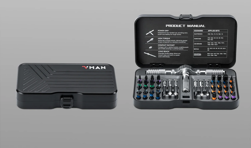 Прецизионный комплект от MIJIA (экосистема Xiaomi) содержит 32 биты из стали S2 и алюминиевую рукоятку с магнитным креплением. Набор включает насадки типов PH, SL, Pentalobe, Torx, Y, U и Hex. Длина бит — 37 мм, рукоятки — 150 мм. Кейс из алюминиевого сплава снабжён магнитной системой хранения, предотвращающей потерю деталей.