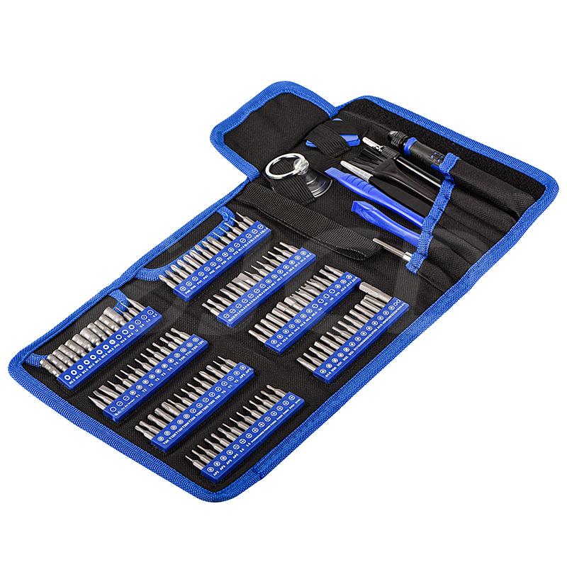 В наборе 98 бит и 17 дополнительных аксессуаров: пинцет, медиаторы, присоска, намагничиватель, ключ для SIM-карты и гибкий удлинитель. Все элементы выполнены из хромованадиевой стали и имеют магнитную основу. Форматы насадок включают крестовые, шлицевые, Torx, Hex, треугольные, Y-образные и многоточечные типы. Комплект используется для ремонта ноутбуков, смартфонов и планшетов разных производителей.