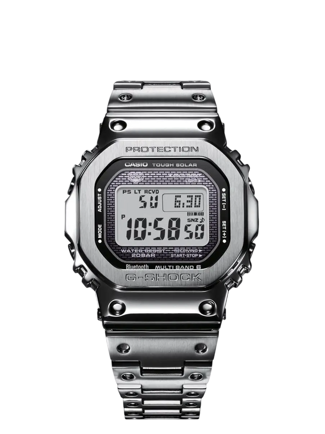 Кварцевый механизм с синхронизацией по Bluetooth и радиосигналу автоматически корректирует время в 38 часовых поясах. Цифровой дисплей с LED-подсветкой дополнен аналоговыми маркерами.