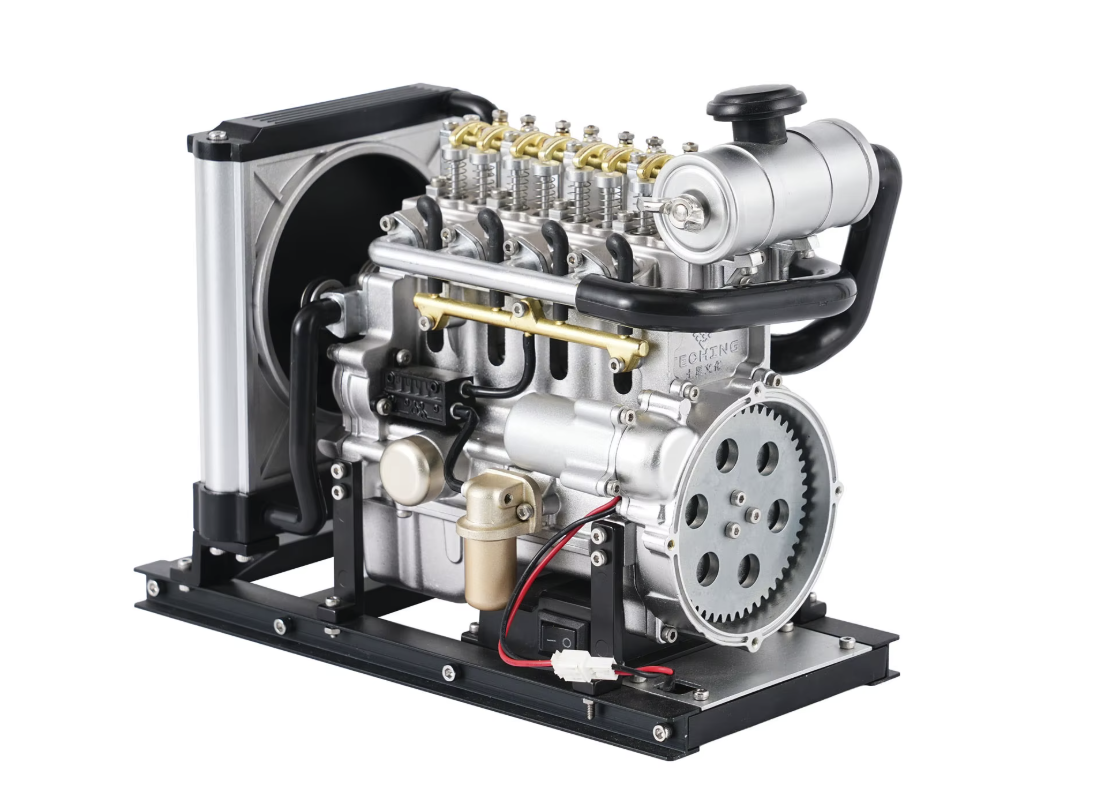 Это компактная металлическая модель четырёхцилиндрового дизельного двигателя, рассчитанная на тех, кому интересна сама механика, а не просто внешний вид. В наборе более 300 деталей из алюминиевого сплава и нержавеющей стали, и сборка здесь ощущается как небольшой инженерный процесс: последовательный, местами требующий внимания, но без лишней сложности.