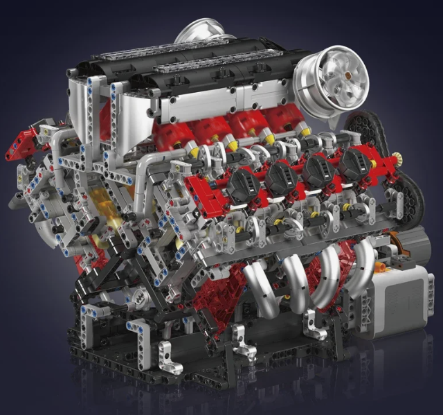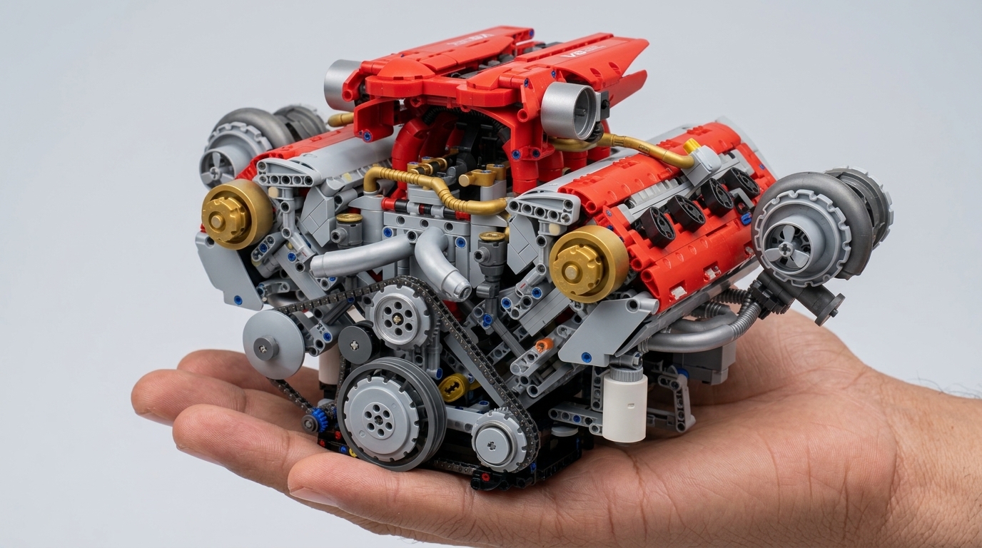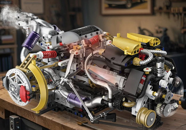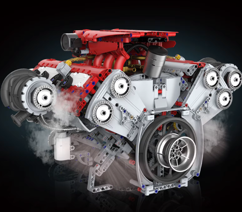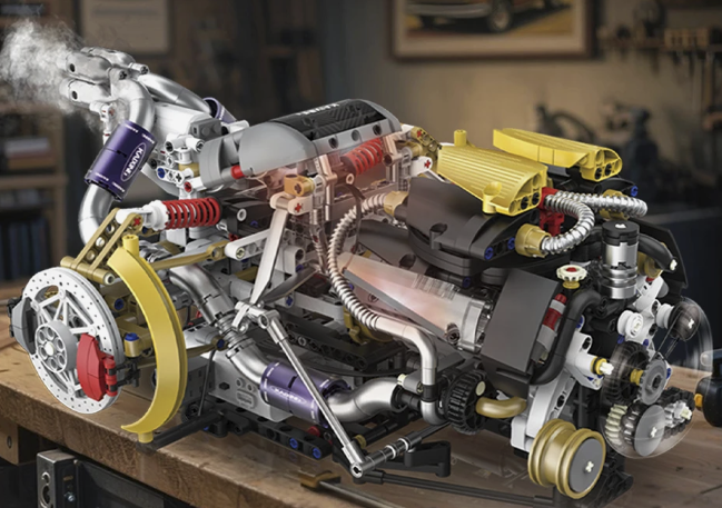Это уже не просто конструктор, а довольно детализированная имитация автомобильного двигателя с акцентом на механику и визуальную проработку. В наборе более 3100 деталей, и за счёт этого удаётся передать не только форму, но и внутреннюю логику: блок цилиндров, элементы газораспределения, приводные узлы, система охлаждения.