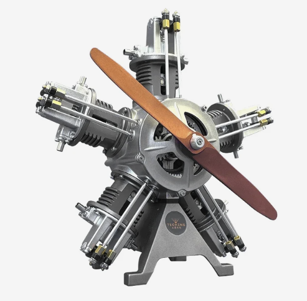 Модель оснащена электроприводом на 7,4 В, работает плавно и достаточно реалистично для настольной демонстрации. Поверхность с металлическим эффектом выглядит убедительно, без излишней декоративности. В комплекте есть подставка и табличка, поэтому после сборки двигатель воспринимается как полноценная выставочная модель.