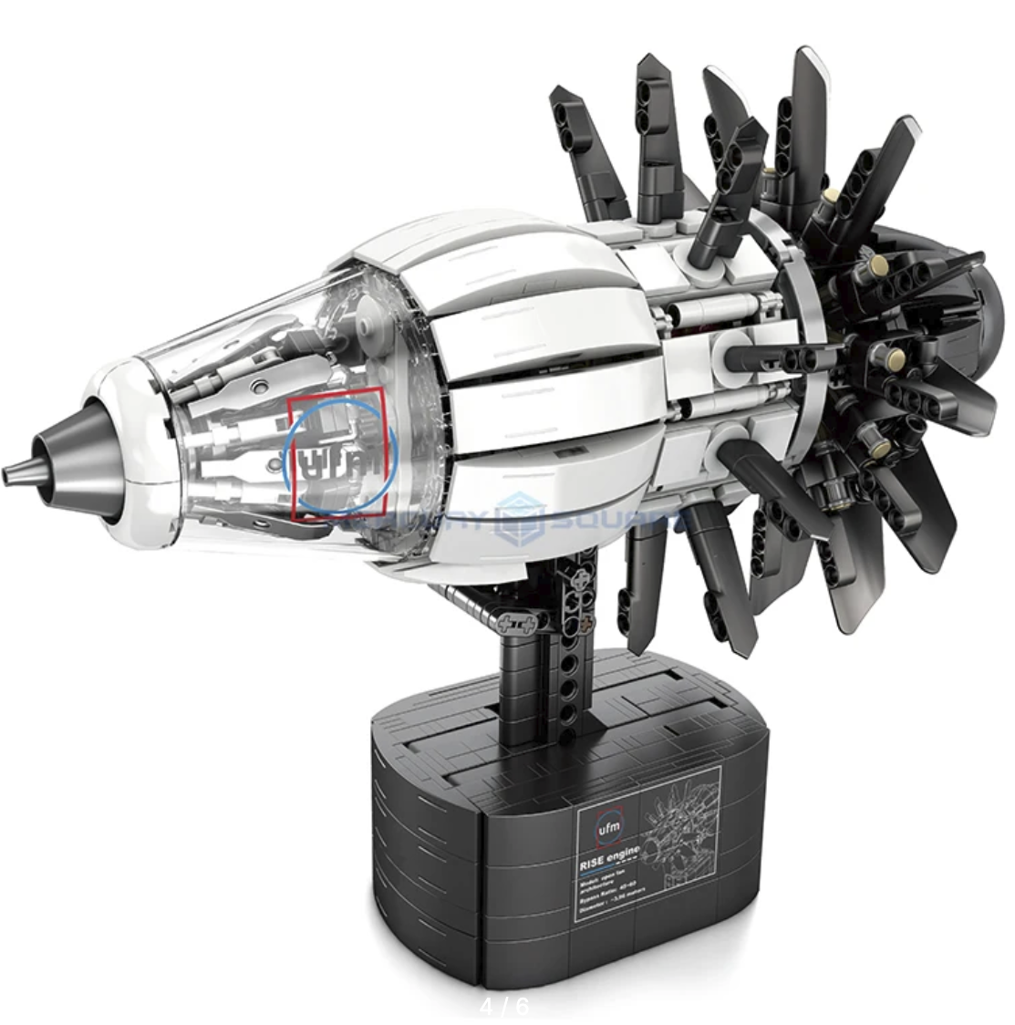 Это модель авиационного двигателя, выполненная в формате конструктора из более чем 1300 деталей. Основной акцент сделан на форме и деталях: модель передаёт внешний облик и компоновку двигателя, сохраняя характерные элементы и пропорции.