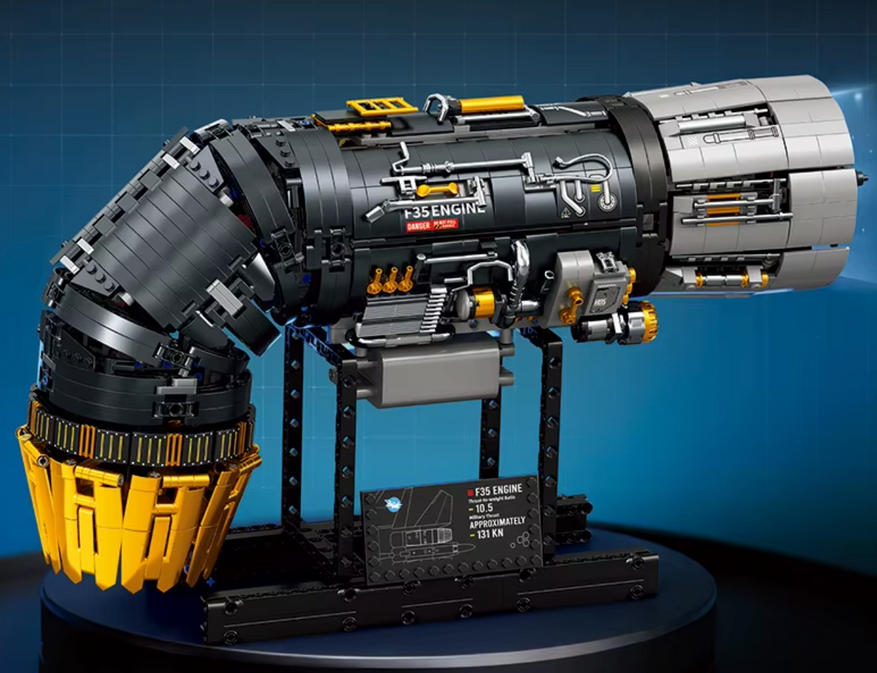 Модель турбореактивного двигателя F35B в масштабе 1:17 — это аккуратно продуманный технический конструктор, рассчитанный на тех, кому важны детали. В наборе около 1800 элементов, и сборка постепенно раскрывает логику конструкции: от корпуса до ключевых узлов, включая характерную поворотную насадку с отклонением на 90°, как у оригинала.