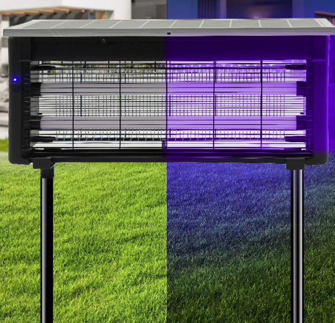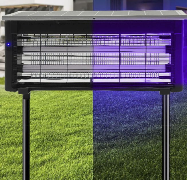 Работает всё по проверенной схеме: ультрафиолет привлекает насекомых, ток уничтожает их мгновенно. В центре длинная УФ-лампа, светит на ту же длину волны 365 нм, которую комары особенно «любят». Подключать не надо — внутри солнечная панель, так что никакие розетки и удлинители по участку не понадобятся.