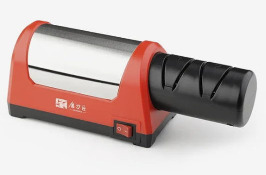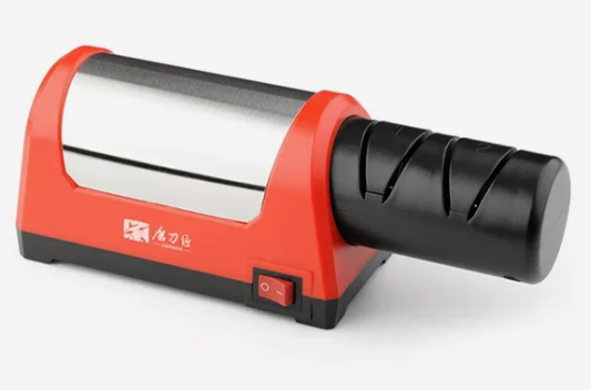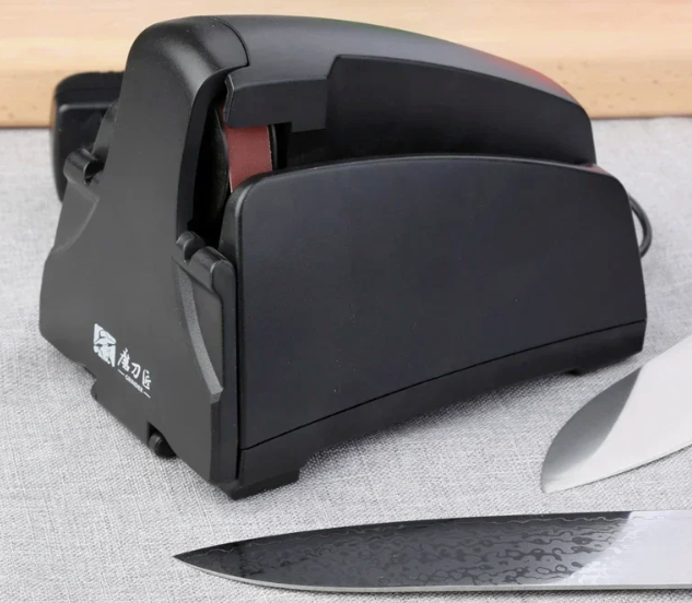 Электрическая точилка с полностью медным двигателем мощностью 50 Вт и фиксированным углом заточки около 15°. Конструкция рассчитана на быстрое восстановление режущей кромки за счёт высокоскоростного шлифовального круга (до 2800 об/мин). Обработка выполняется через направляющие пазы: основные для ножей, отдельный паз предусмотрен для ножниц, цилиндрический для мелкого инструмента.