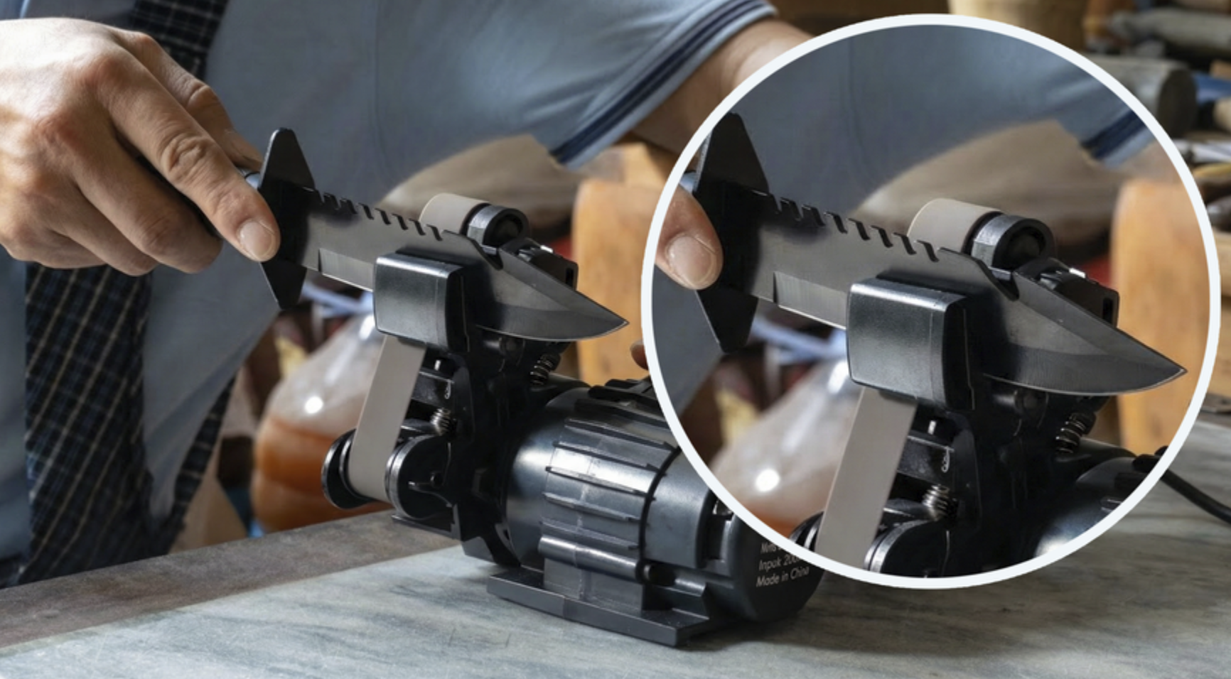 Работа сводится к проведению лезвия через слот несколько раз без дополнительного давления. Предусмотрена защита от перегрева: при длительной нагрузке устройство автоматически отключается и возобновляет работу после охлаждения. Подходит для кухонных ножей и бытового инструмента.