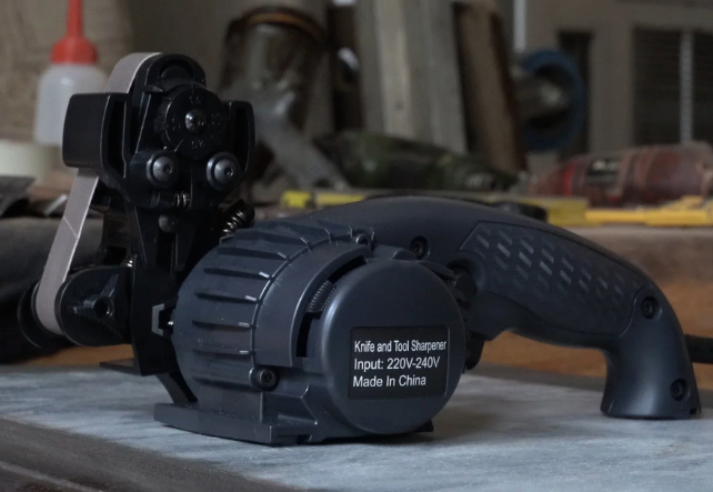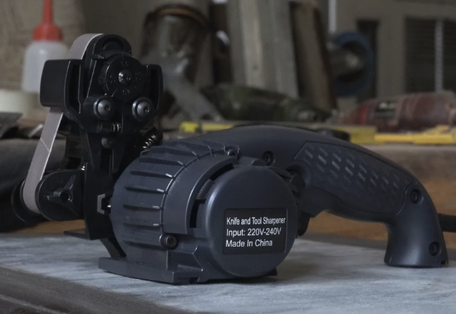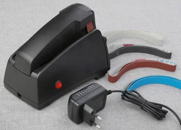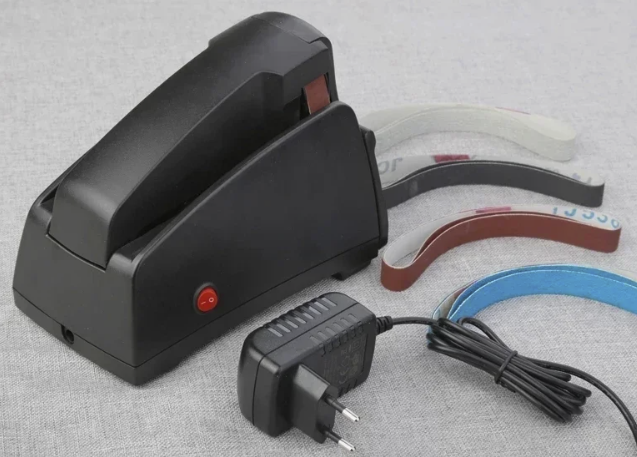 Это ленточный формат с настраиваемым углом в пределах примерно 15-30°. Подходит не только для обычных кухонных ножей, но и для зубчатых лезвий, ножниц и разного бытового инструмента. В работе используются сменные абразивные ленты разной зернистости: сначала более грубая обработка, затем доводка.