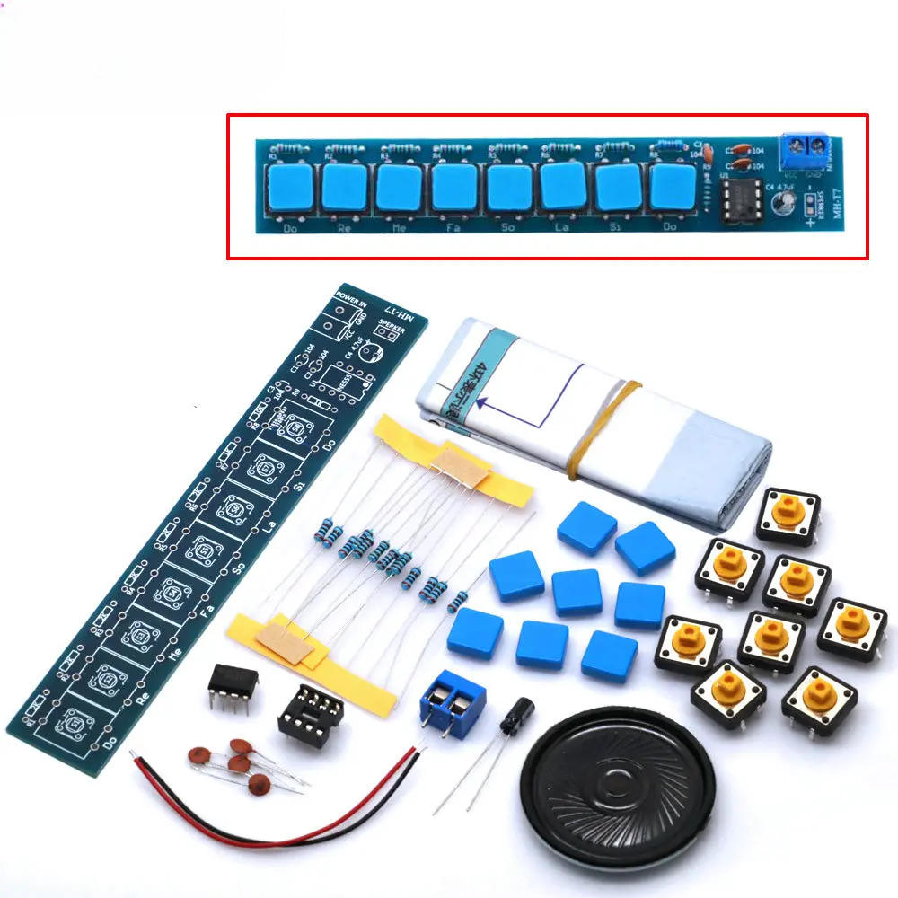 Микросхема NE555 используется в качестве генератора колебаний. Частота вырабатываемого сигнала определяется значениями сопротивлений цепи — резисторы R2-R9, совместно с резистором R1 и конденсатором C2, создают девять различных частот. Восемь тактовых кнопок (S1-S8) позволяют выбирать нужную частоту для воспроизведения соответствующей ноты.