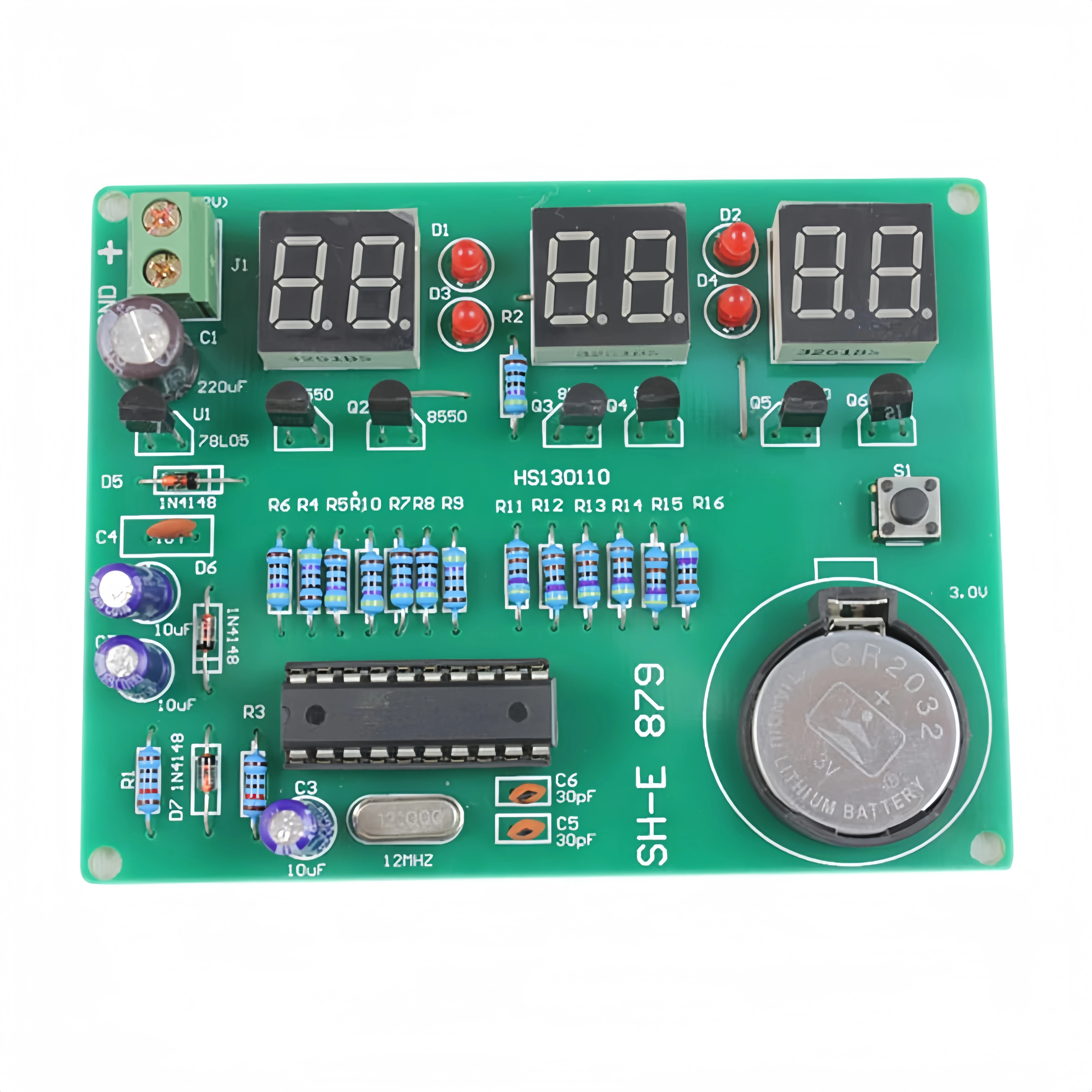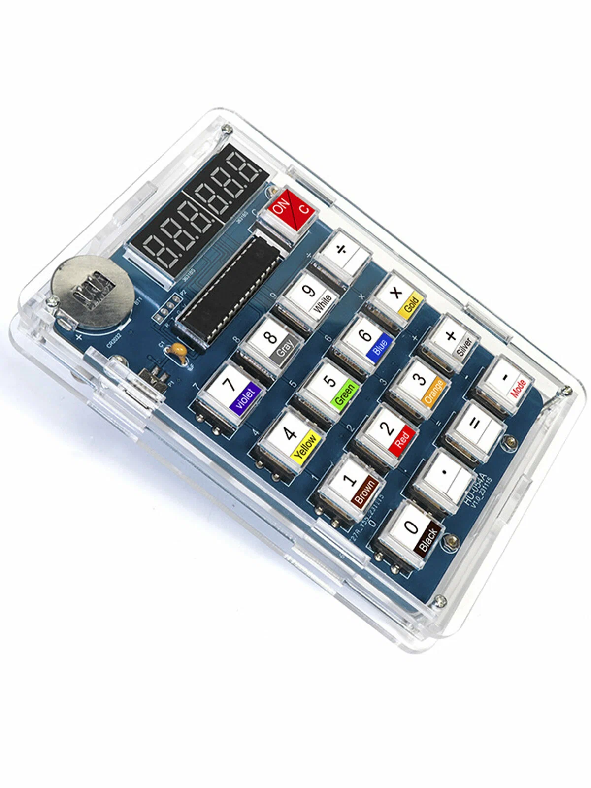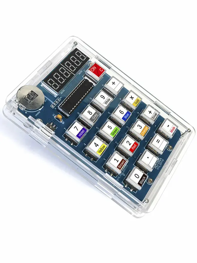 В набор входит печатная плата с предварительно нанесённой разметкой, микроконтроллер (поставляется в отдельном гнезде для удобства демонтажа), два трёхзначных семисегментных индикатора, семнадцать тактовых кнопок с колпачками, керамический конденсатор, разъём питания и держатель батарейки.