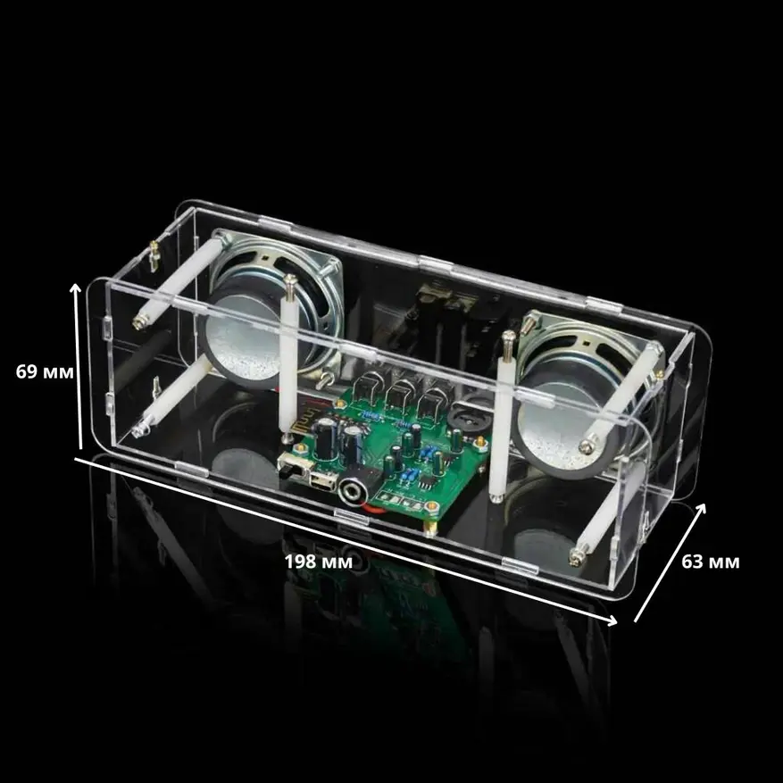 В набор входят резисторы, электролитические конденсаторы, транзисторы, интегральные схемы, переключатель, светодиоды, соединительные кабели, динамики и акриловый корпус. Управление осуществляется через Bluetooth.