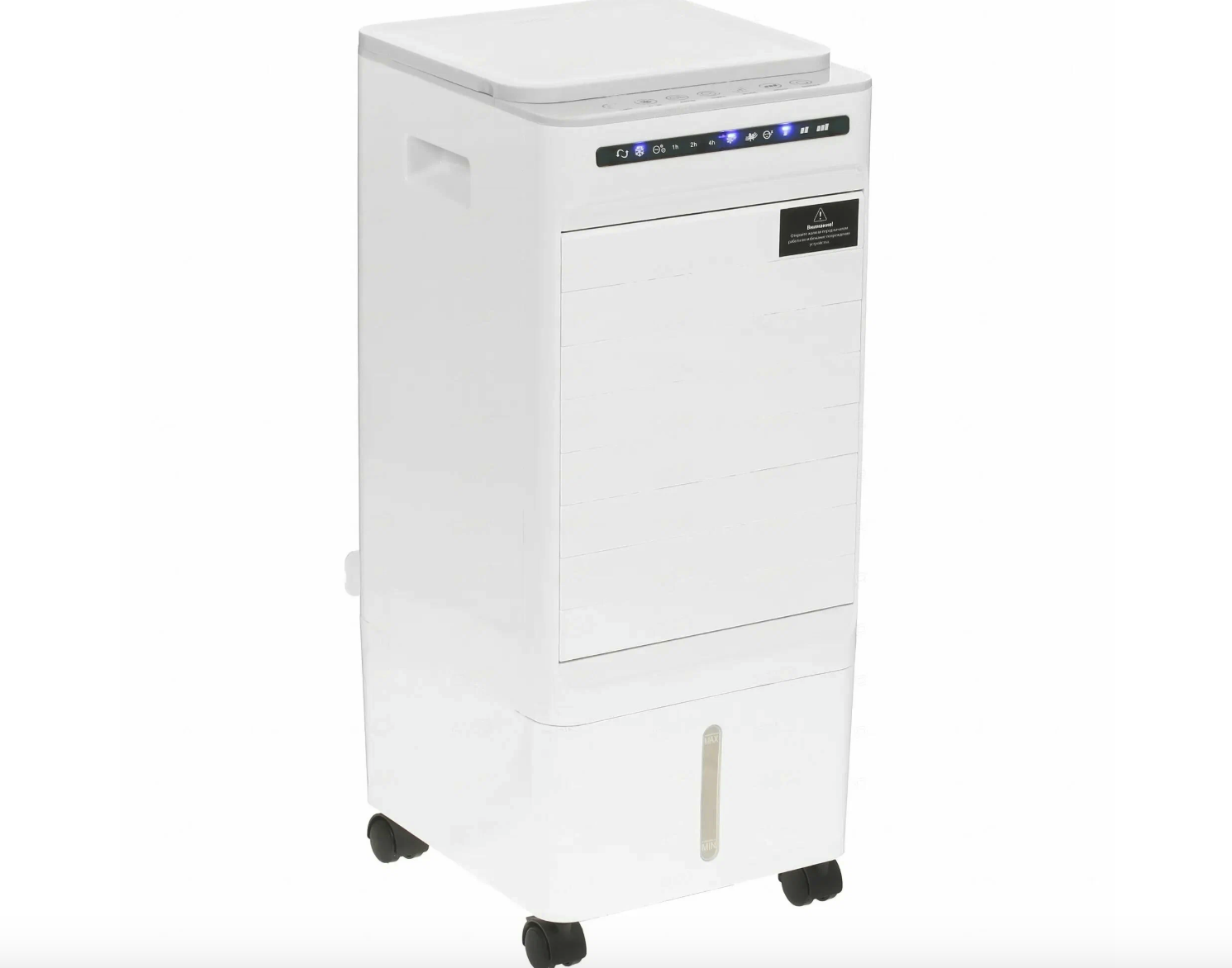 У прибора мощный испарительный механизм с циркуляцией воды и возможностью добавления льда, а значит, воздух становится не только прохладнее, но и мягче, легче для дыхания. Поток направленный, но широкий, «дальнобойный» до 10 метров. Эффект действительно чувствуется даже в большой комнате.
