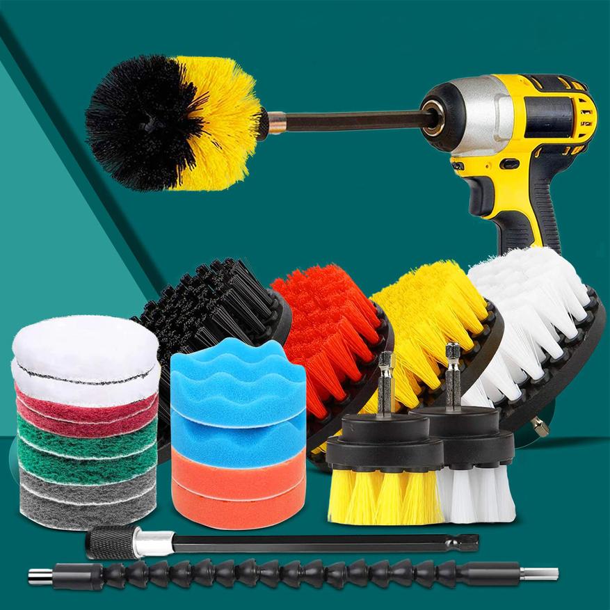 Комплектов — несколько, есть как просто с удлинителем и щетками, так и дополнительно с удлинителем для труднодоступных мест, подложкой-липучкой и насадками для полировки.