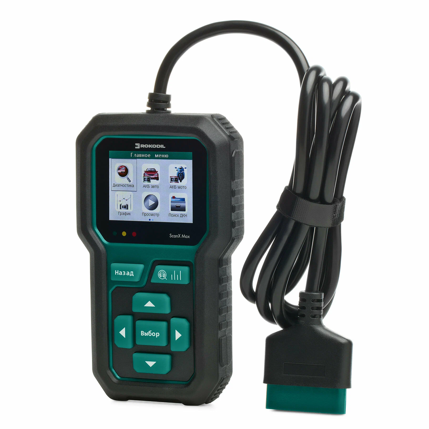 Начнем нашу подборку с универсального автомобильного сканера Rokodil ScanX Max, который позволяет проводить не только диагностику электронных блоков автомобиля, но и проверять аккумуляторную батарею. Сканер поддерживает большинство распространенных протоколов связи ЭБУ для автомобилей старше 1996 годов, а значит диагностика возможна с большей частью иномарок и отечественных автомобилей. Для диагностики не потребуется отдельное питание, так как Rokodil ScanX Max его берет от OBD2. С помощью автосканера можно проверить на возникающие ошибки и сбросить их в случае обнаружения. Кроме того, можно наблюдать в режиме реального времени за различными датчиками, диагностировать выхлопную систему на соблюдение нормам экологичности. А еще Rokodil ScanX Max способен проводить диагностику аккумуляторной батареи, что крайне редко доступно для аналогичных гаджетов. Сканер способен работать с различными аккумуляторными батареями до 12 вольт, в том числе и мотоциклетными. Для удобства используется большой цветной экран, на который выводится вся необходимая информация на русском языке. Сканеру не требуется подключение к сети интернет или дополнительного программного обеспечения.