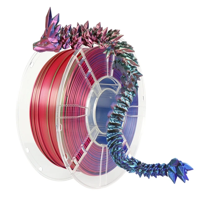 Если PRYNZU впечатляет мягкими переходами и гладкой структурой, то ERYONE Tri-Color делает ставку на эффект и точность. Здесь используется классическая трехцветная коэкструзия, но с более строгим контролем геометрии и стабильности потока. Каждый слой печатается чисто, без пузырей и пропусков, а переливы между цветами выглядят контрастнее, чем у PRYNZU, с четким разделением оттенков на гранях модели. По характеристикам филамент близок к флагманским сериям бренда: диаметр стабилен, с допуском +-0,03 мм, температура печати 190-220°C, стол можно подогревать до 70°C. В сравнении с PRYNZU Silk PLA, различие в подаче цвета и ощущении от модели. PRYNZU делает ставку на плавность и художественность: переливы мягкие, цвета сливаются почти акварельно. ERYONE показывает яркие контрасты и блеск, подчеркивая форму детали. На фигурках или декоративных элементах с рельефом результат будет эффектным, каждый изгиб ловит свет по-своему. Есть в наличие 12 цветов.