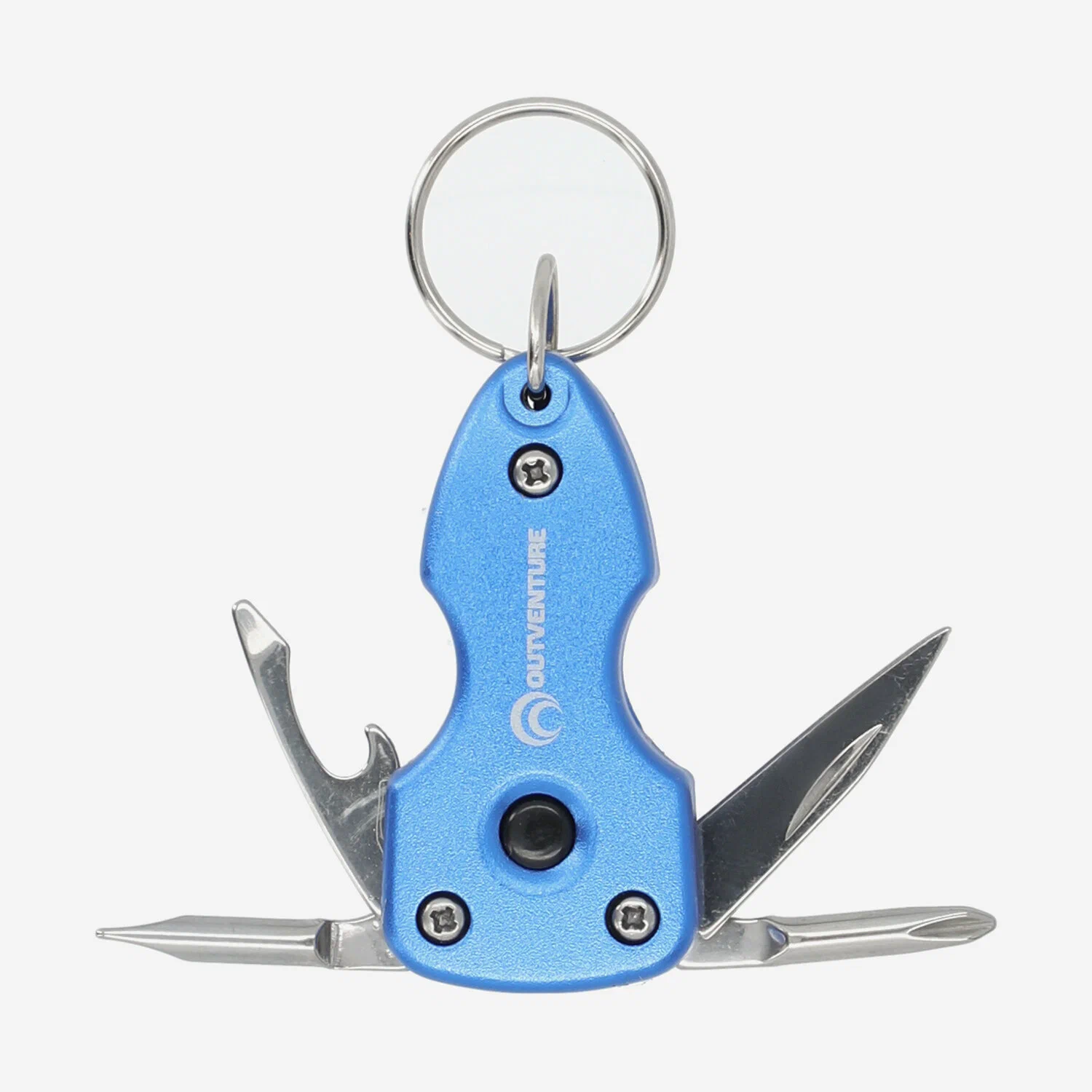Брелок от Outventure (российский бренд, принадлежащий сети «Спортмастер») представляет собой мультитул, произведенный из нержавеющей стали. Он включает в себя крестовую и плоскую отвертки, открывалку и небольшое лезвие. На нижней части мультитула расположен светодиод, который включается/выключается по нажатию на кнопку на лицевой части брелока.
