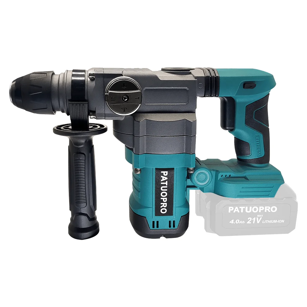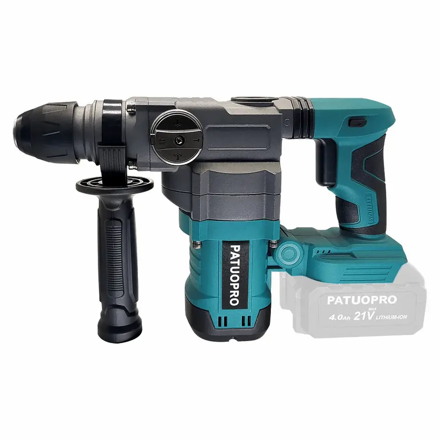 Аккумуляторный перфоратор PATUOPRO выдаёт силу удара 10 Дж и совместим с батареями Makita 18 В. Частота ударов — до 4500 в минуту, обороты — 800 об/мин. Максимальный диаметр сверления достигает 36 мм. Модель оснащена бесщёточным двигателем, поддерживает режимы сверления и долбления. Патрон фиксирует оснастку без люфта, а 360° ручка облегчает работу. Вес без аккумулятора — 3,44 кг. В продаже есть комплектации с одним или двумя аккумуляторами и зарядным устройством.
