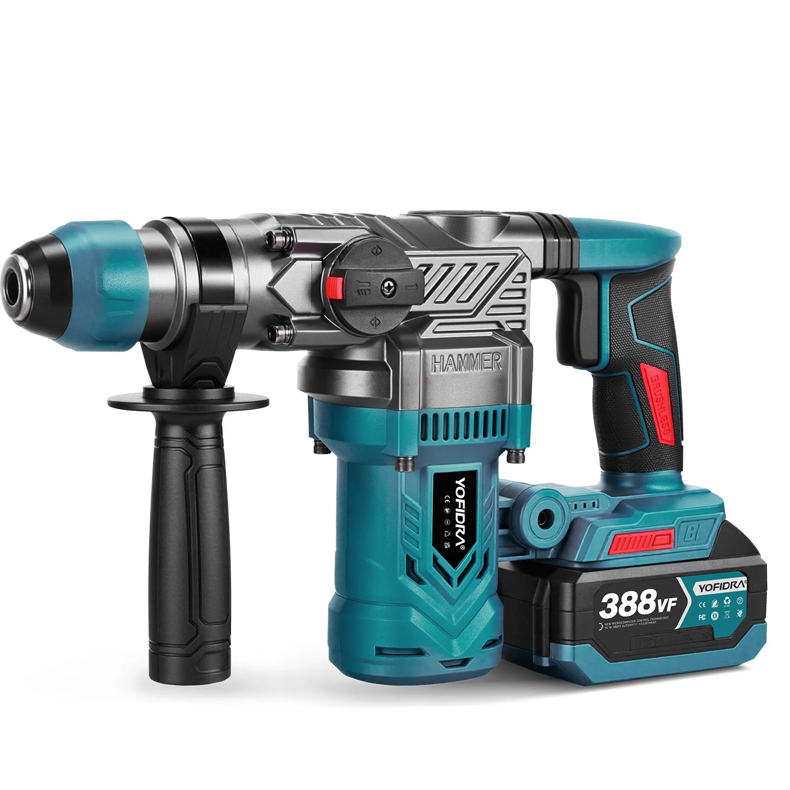YOFIDRA — мощный бесщёточный перфоратор на 18-21 В и 2200 Вт. Частота ударов — до 6400 в минуту, скорость холостого хода — 5200 об/мин. Диаметр сверления — 26 мм. Реализованы два режима: обычное и ударное сверление. Используется патрон SDS, защита от заклинивания, металлический корпус и батарея с 10 ячейками по 1500 мА·ч для стабильной работы.
