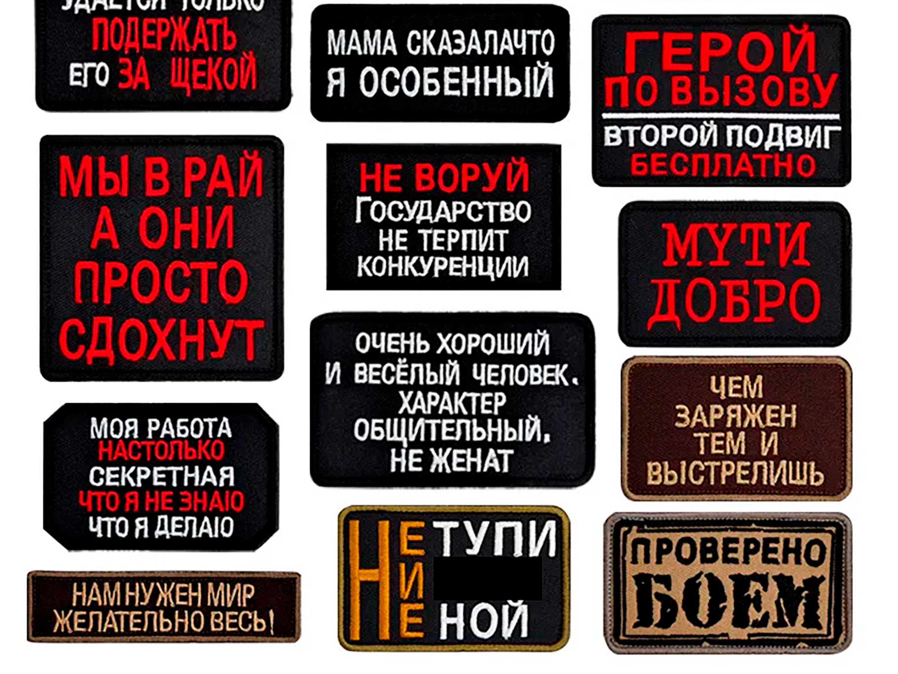 Отдохнём немного от излишнего пафоса и перейдём к чему-нибудь более жизнерадостному и лёгкому. Например, к коллекции «Поговорки» из 9 нашивок с забавными цитатами и юмористическими высказываниями в духе народного фольклора.