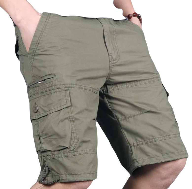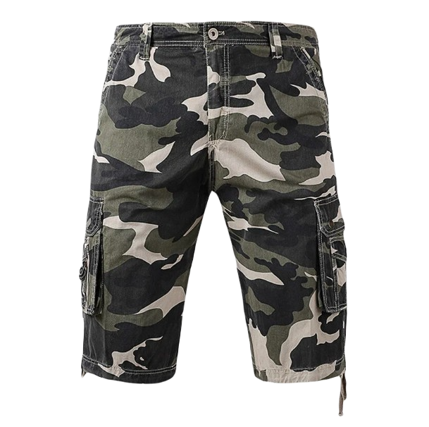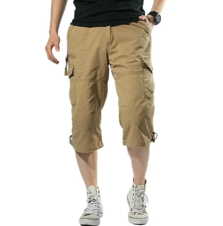 Крепятся на талии благодаря резинке. Длина примерно до колена. Есть 4 кармана по бокам — 2 на уровне бедер, два других расположены чуть выше колена. Снизу штанины подвернуты.
