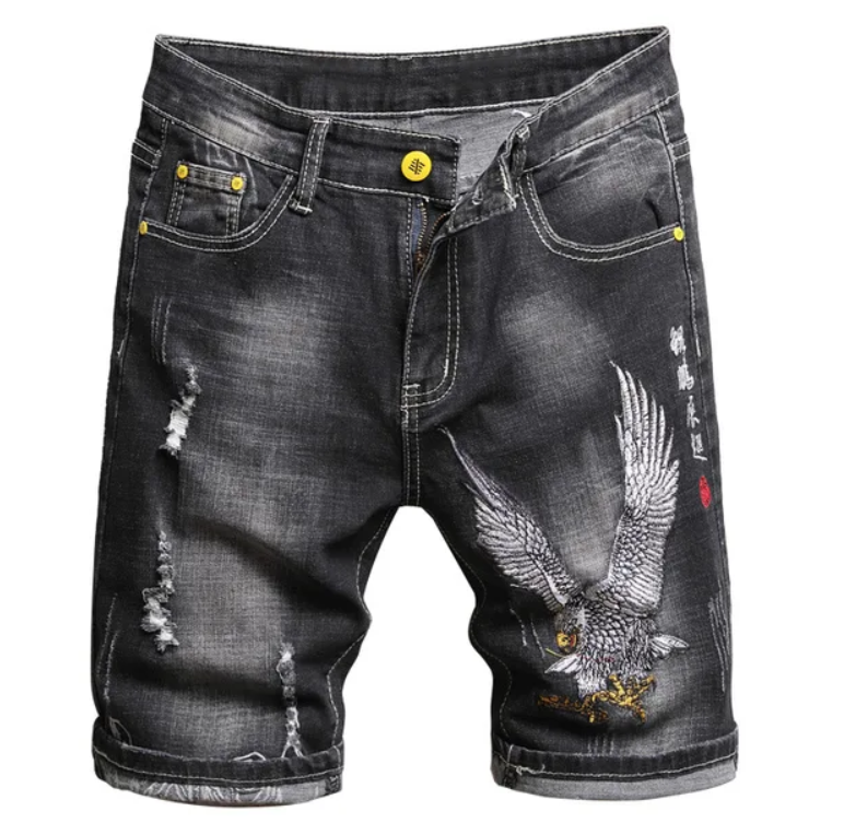 Модель, дизайн которой представляет собой слегка потертую ткань и орла внизу левой штанины. Штанины снизу немного подвернуты.