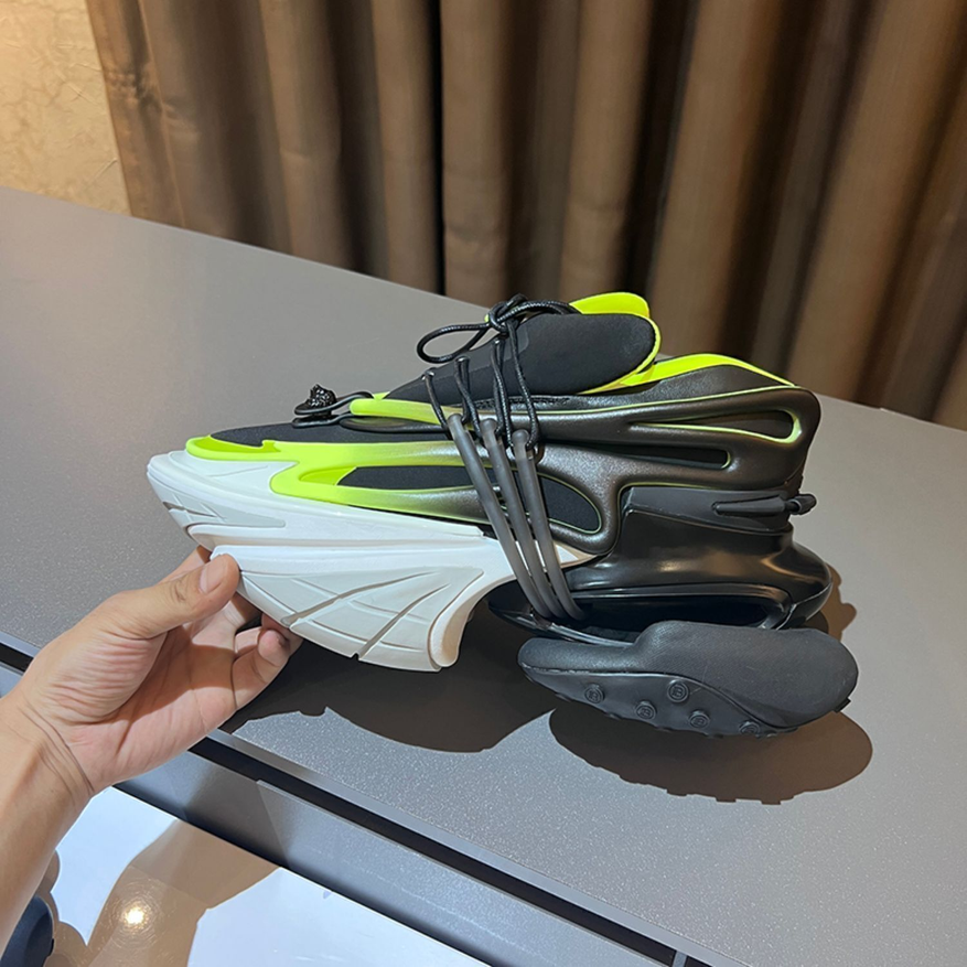 Кроссовки рассчитаны на весенне-осенний сезон и обладают износостойкими и дышащими свойствами. Дизайн необычен: каждый кроссовок имеет разный цвет — один выполнен в черном, другой в белом цвете, но в единой стилистике. Модель обладает круглым носком и платформенной подошвой, что подчеркивает ее принадлежность к современным городским трендам.