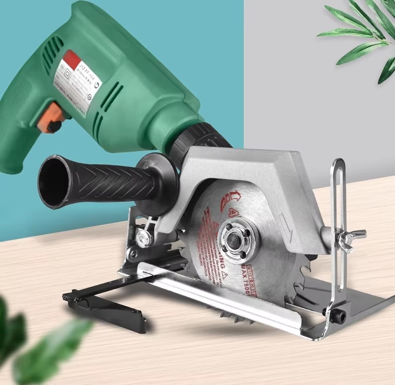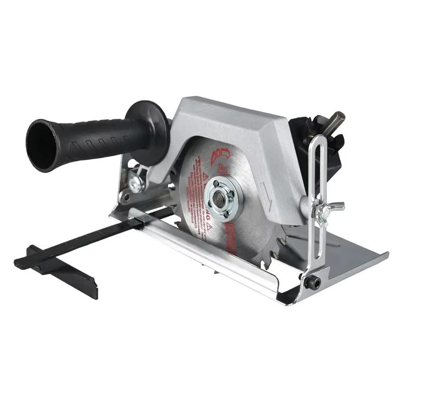 Сам адаптер представляет собой металлическую конструкцию с такими основными элементами: регулируемая направляющая, редуктор с шестигранным хвостовиком для подсоединения дрели, защитный кожух, пильный диск, а также съемная прорезиненная ручка. Глубина реза — до 75 мм.